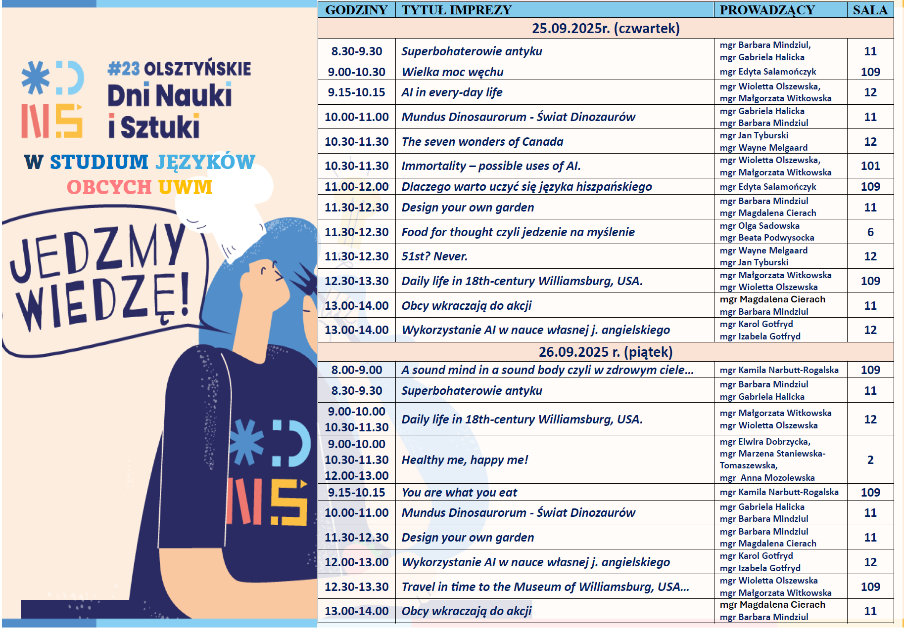 | 6 | 25 września 2025 | 11.30-12.30 | O. Sadowska, B. Podwysocka | Food for thought czyli jedzenie na myślenie | |