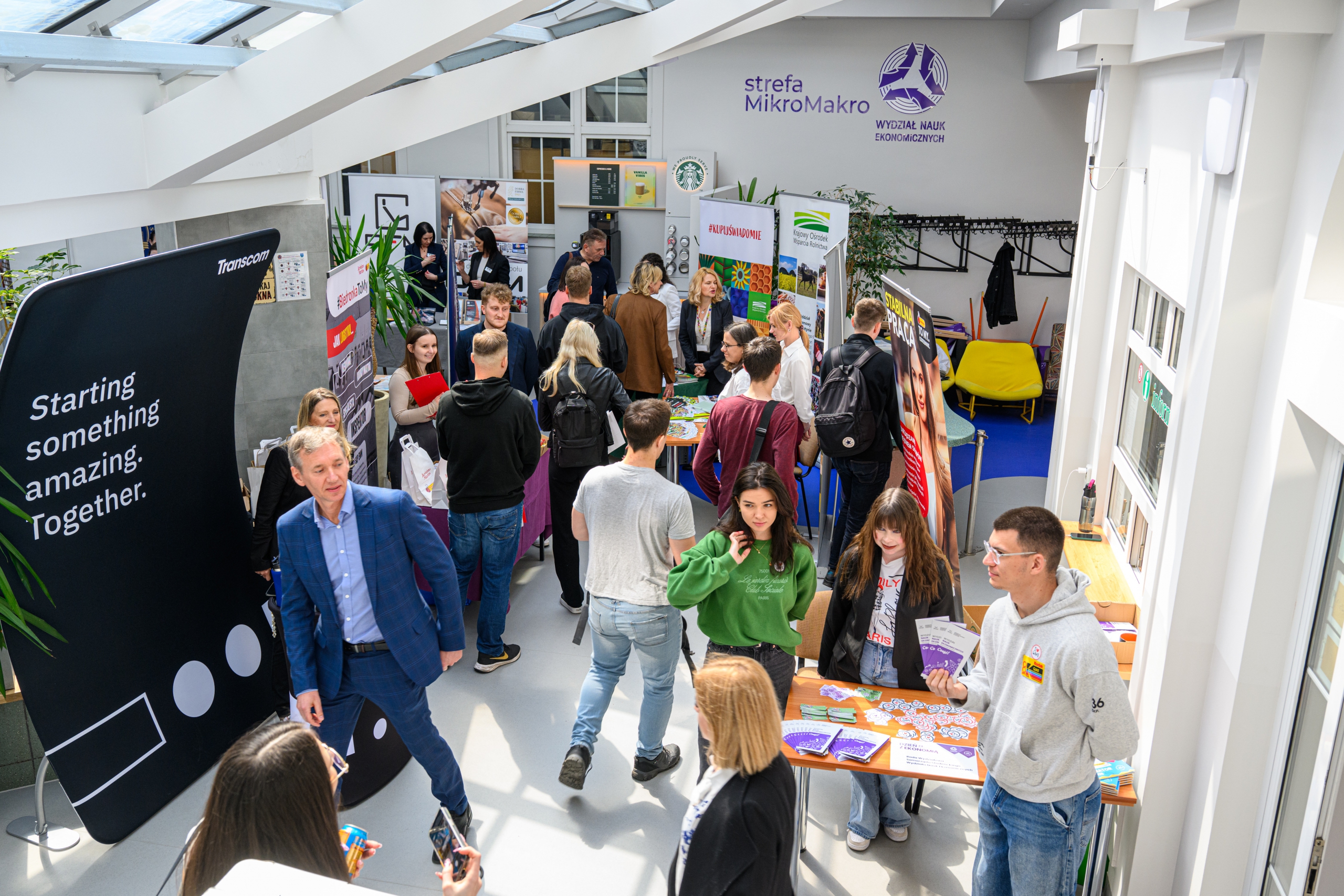 W holu Wydziału Nauk Ekonomicznych uczestnicy mogli odwiedzić stoiska kół naukowych, Rady Wydziałowej Samorządu Studentów oraz porozmawiać z przedstawicielami firm i organizacji oferujących możliwości rozwoju zawodowego, staży i praktyk.