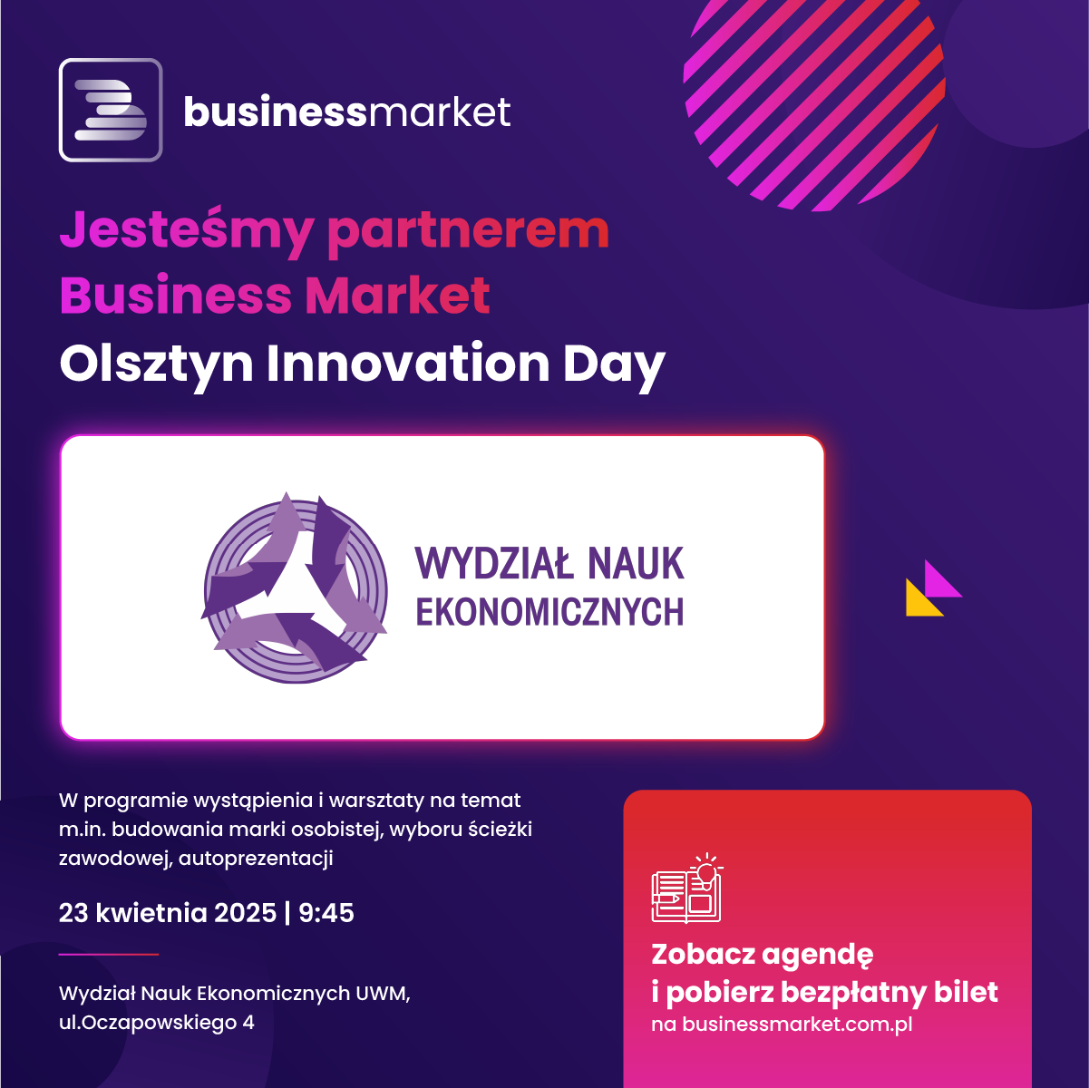 W środę, 23 kwietnia 2025 roku, na Wydziale Nauk Ekonomicznych odbędzie się wydarzenie Business Market – Olsztyn Innovation Day. To świetna okazja, żeby dowiedzieć się więcej o tym, jak zmienia się rynek pracy, czego potrzebują pracodawcy i jak przygotować się na zawodową przyszłość.