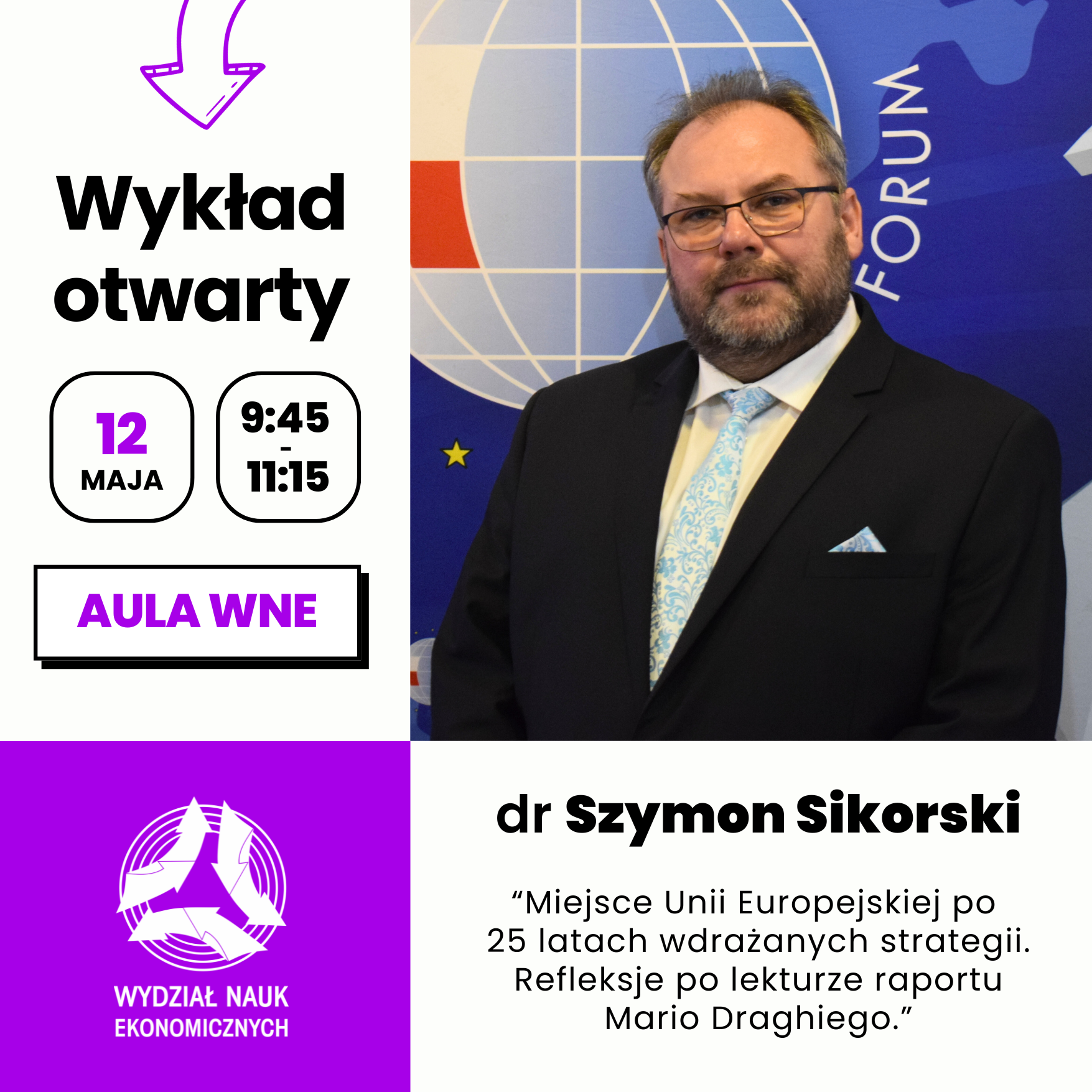 Zapraszamy na wykład otwarty pt. „Miejsce Unii Europejskiej po 25 latach wdrażanych strategii. Refleksje po lekturze raportu Mario Draghiego”, który wygłosi dr Szymon Sikorski – analityk, politolog, historyk i ekspert w zakresie polityki publicznej i międzynarodowej.