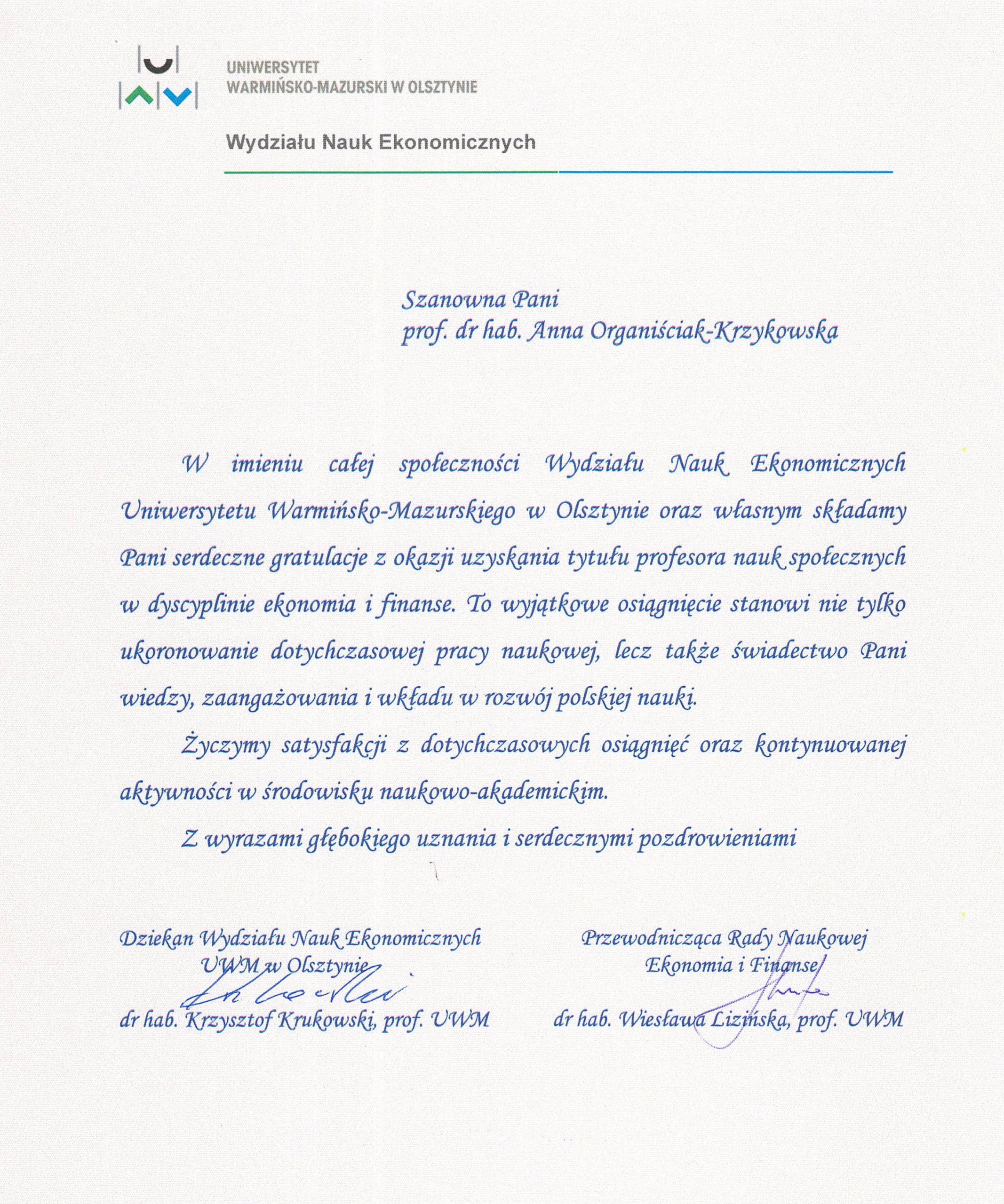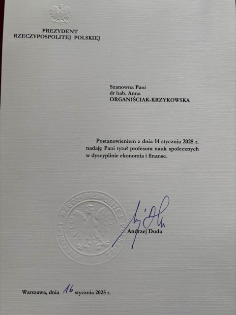 Władze Wydziału złożyły gratulacje Pani Profesor Annie Organiściak-Krzykowskiej - emerytowanemu pracownikowi Wydziału Nauk Ekonomicznych z okazji nadania tytułu profesora w dyscyplinie ekonomia i finanse. To zasłużone wyróżnienie jest dowodem wybitnych osiągnięć naukowych, zaangażowania oraz wieloletniej pracy w służbie rozwoju nauki i edukacji.