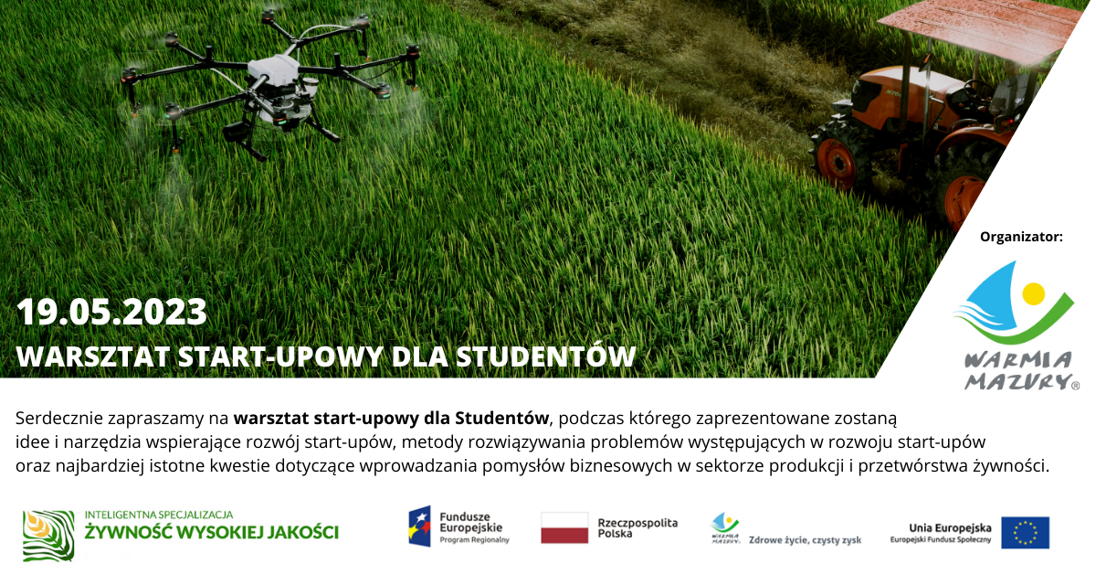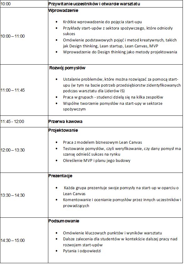 Warsztat dedykowany jest dla studentów, którzy są zainteresowani inkubacją pomysłów w ramach Inteligentnej Specjalizacji „Żywność Wysokiej Jakości”. Celem spotkania jest rozwój pomysłów biznesowych z zakresu IS w ramach platform startowych przy wykorzystaniu metod kreatywnych oraz współpracy uczestników. Podczas spotkania, trener Marcin Dominiak postara się pokazać, że „chcieć to móc” – zaprezentuje uczestnikom idee i narzędzia do rozwoju start-upów, przedstawi problemy i metody ich rozwiązywania oraz wskaże najbardziej istotne kwestie dotyczące wprowadzania pomysłów biznesowych w kontekście sektora produkcji i przetwórstwa żywności wysokiej jakości.