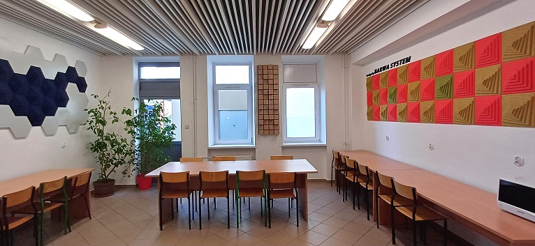 Pokój przeznaczony do pracy własnej studentów wyposażony jest w stoły z dostępem do zasilania elektrycznego, na których można wygodnie pracować z laptopem, korzystając z dostępu do sieci internetowej EDUROAM.