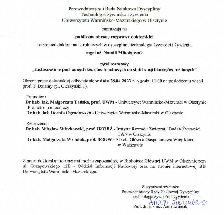 28.04. 23., godz. 11.00, sala prof. T. Dziamy, Publiczna obrona pracy doktorskiej mgr inż. Natalii Mikołajczak