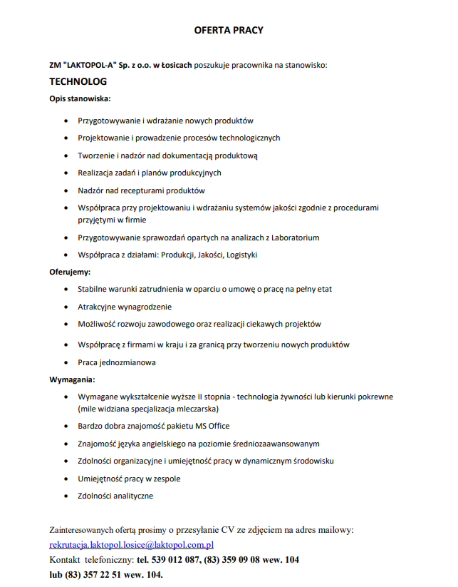 OFERTA PRACY NA STANOWISKO TECHNOLOG: ZM LAKTOPOL-A SP. Z O.O.