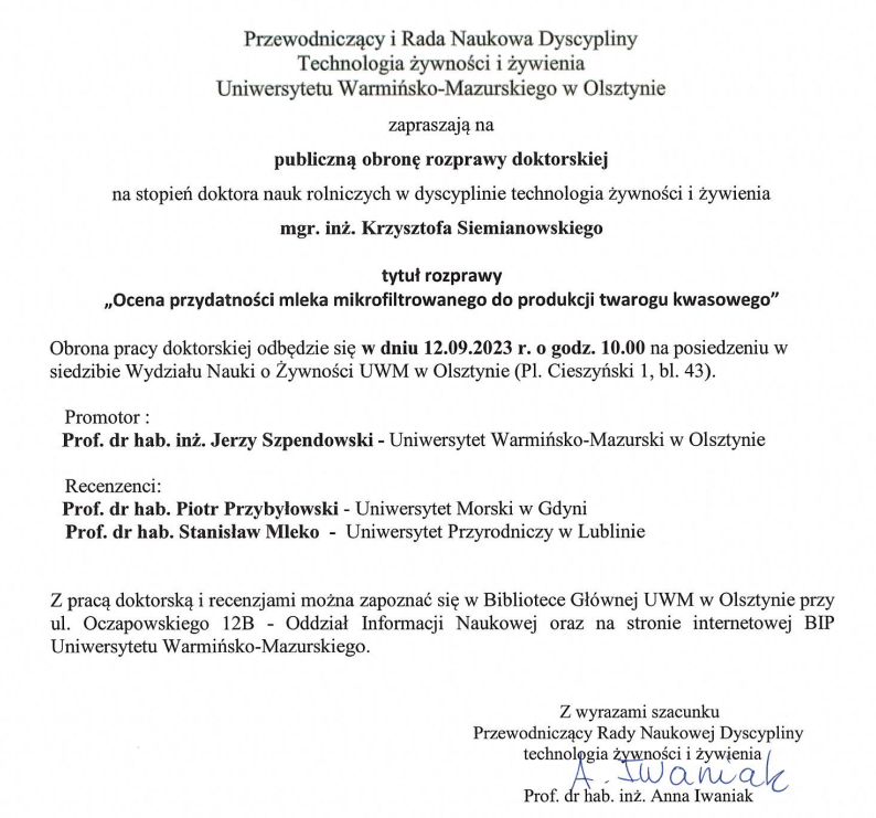 OGŁOSZENIE O PUBLICZNEJ OBRONIE ROZPRAWY DOKTORSKIEJ MGR INŻ KRZYSZTOFA SIEMIANOWSKIEGO, 12 WRZEŚNIA, 10.00