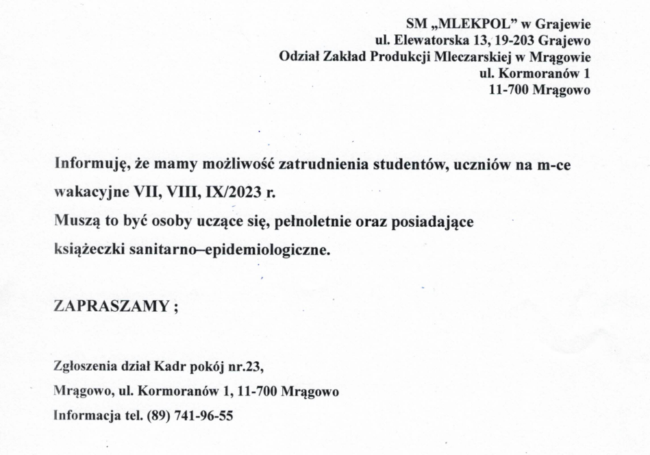 PRACA WAKACYJNA DLA STUDENTÓW W SM MLEKPOL