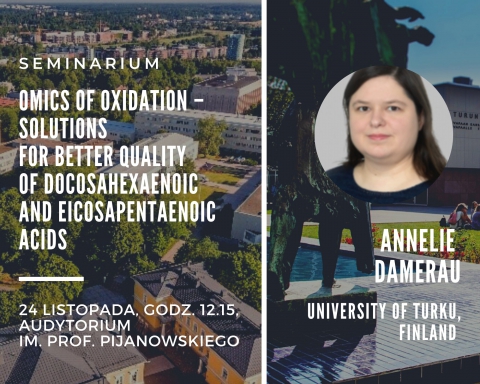 Dr of Food Science Annelie Kristin Damerau, z University of Turku, Finland wygłosi referat nt. "Omics of oxidation – Solutions for better quality of docosahexaenoic and eicosapentaenoic acids", podczas seminarium dyplomowego studentów IV roku kierunku Technologia Żywności i Żywienie Czlowieka, które odbędzie się w najbliższy czwartek 24 listopada, o godzinie 12.15, w audytorium im. prof. Pijanowskiego.