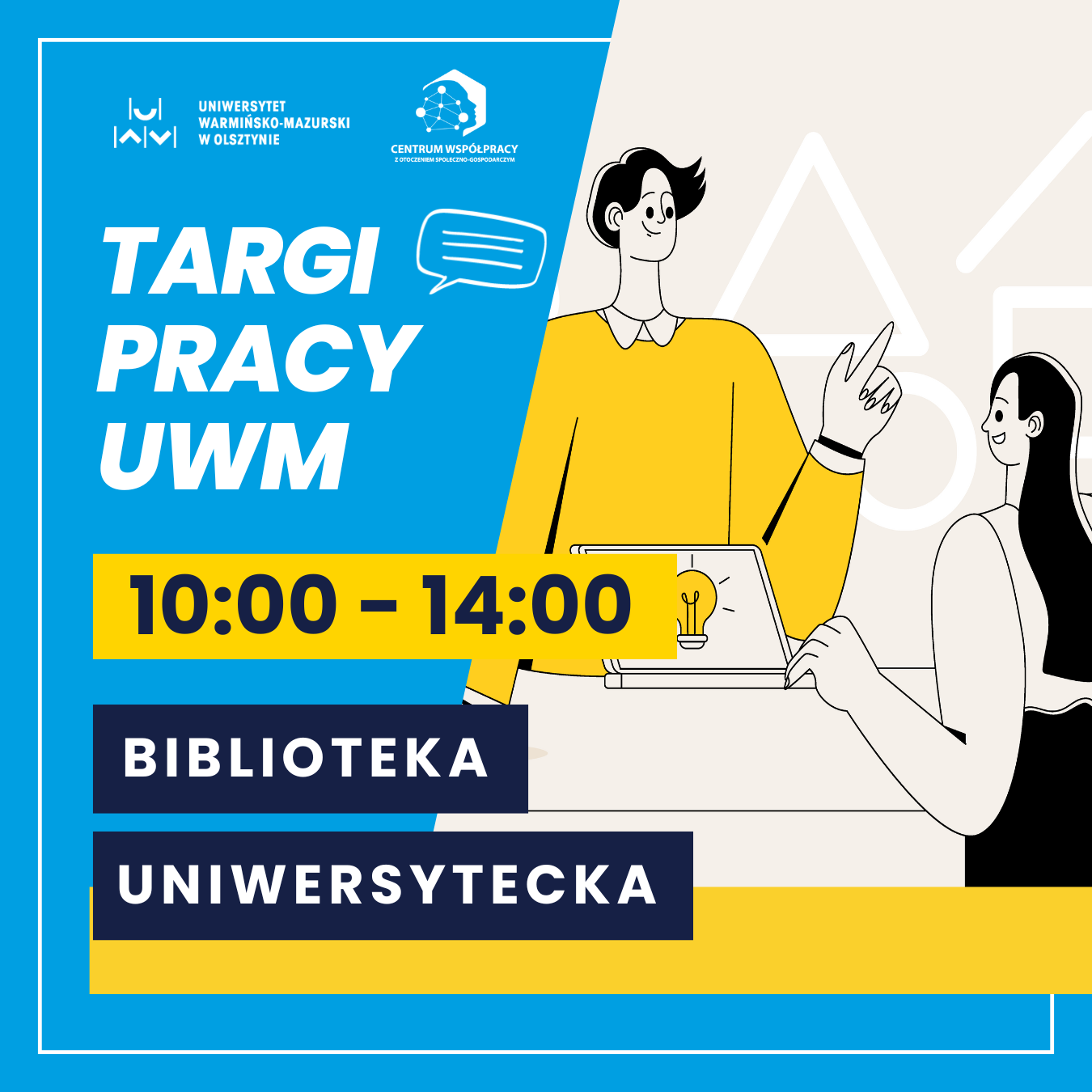 Zapraszamy do udziału w Targach Pracy UWM, które odbędą się 14 maja 2025 roku w Bibliotece Uniwersyteckiej w godzinach 10:00–14:00.