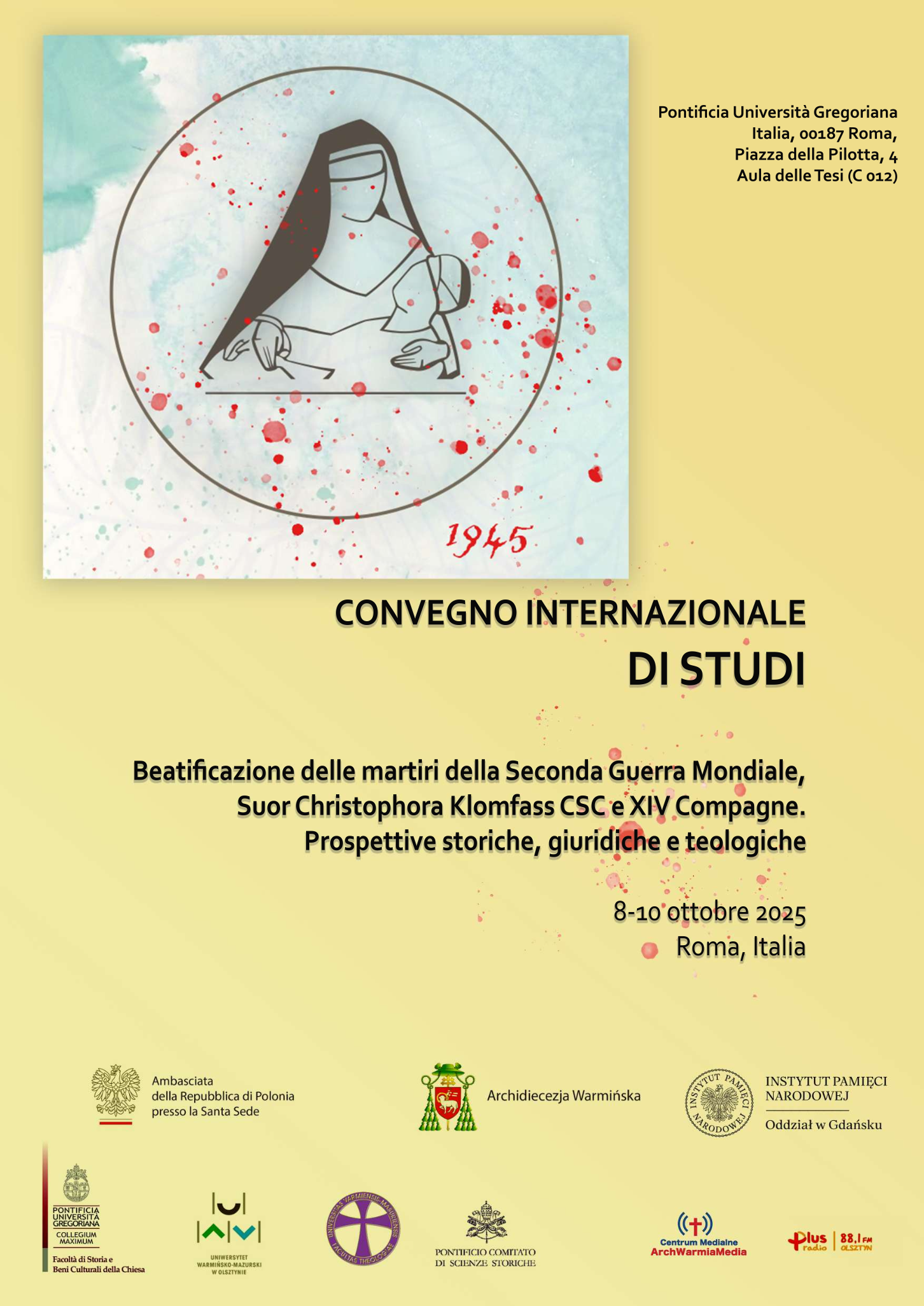 Wydział Teologii Uniwersytetu Warmińsko-Mazurskiego w Olsztynie we współpracy z Papieskim Uniwersytetem Gregoriańskim w Rzymie zaprasza na międzynarodową konferencję naukową poświęconą beatifikowanym 31 maja 2025 roku w Braniewie Siostrom św. Katarzyny Dziewicy i Męczennicy – s. Christophorze Klomfass CSC i XIV towarzyszkom.