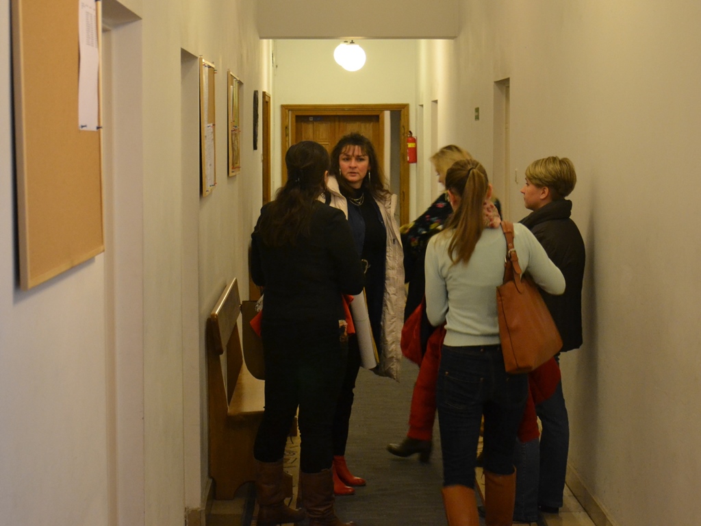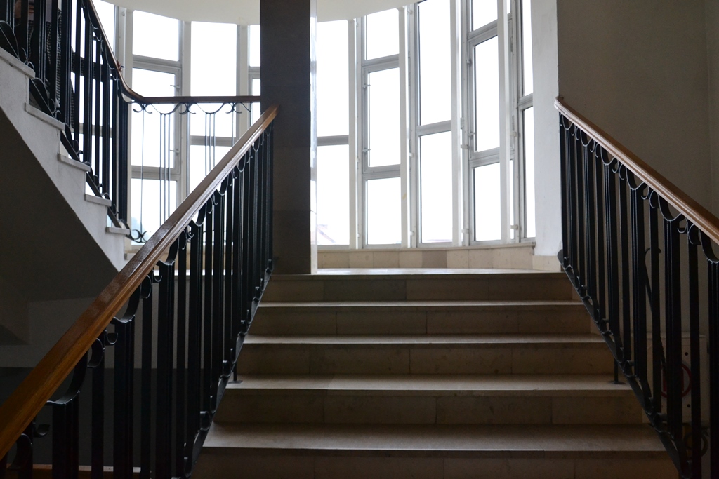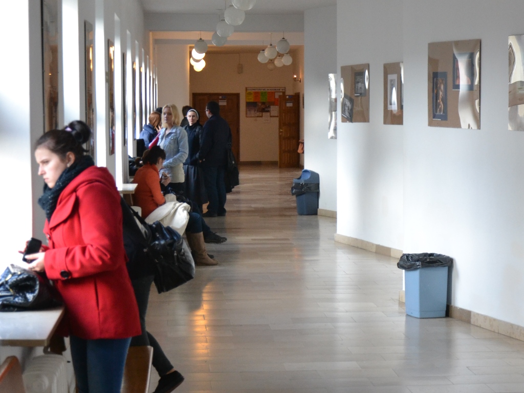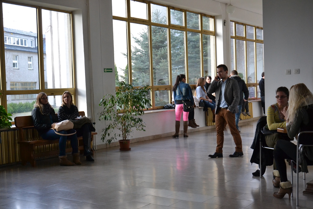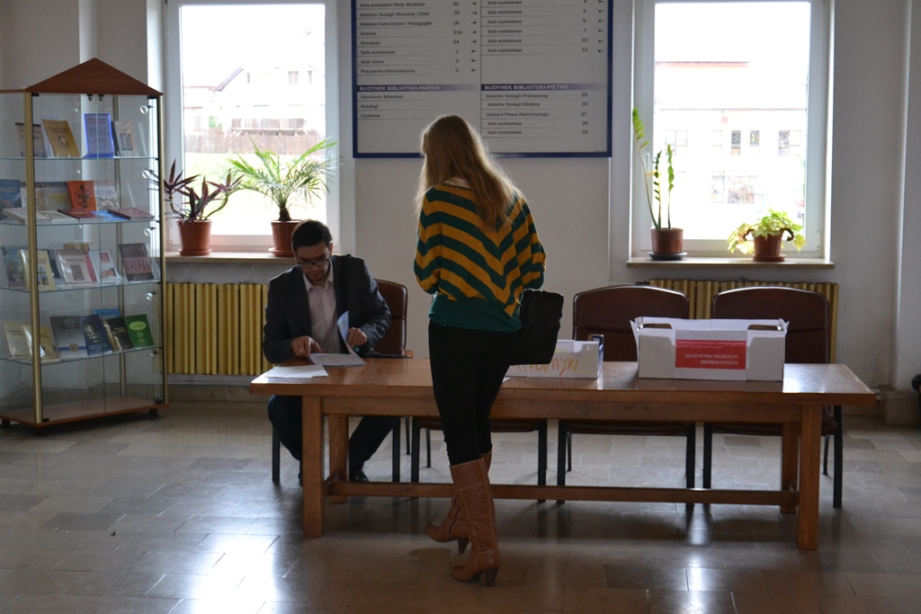 Kierując się od holu głównego w dół dotrzemy do pokoju Samorządu Studenckiego (sala P-3):