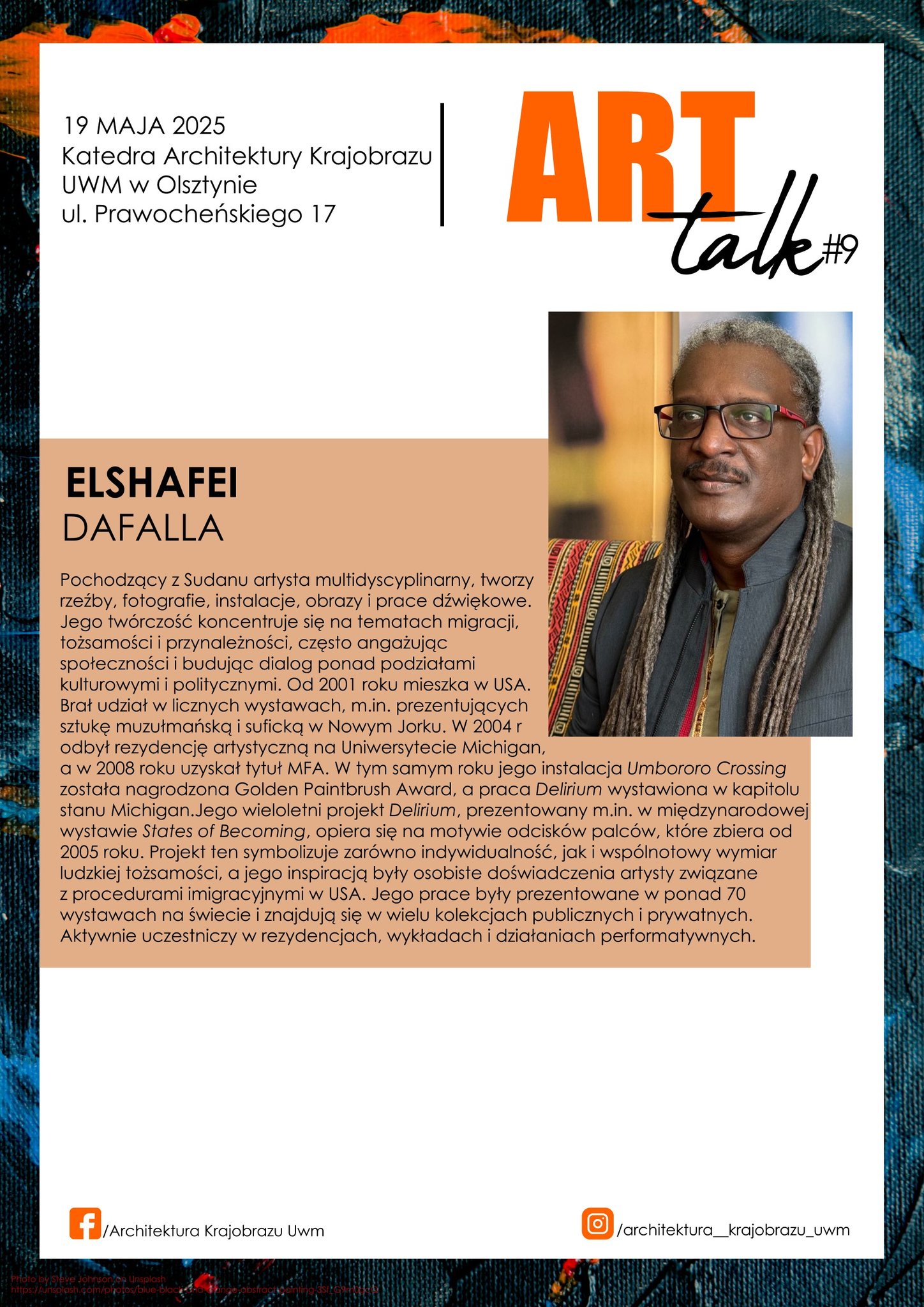 Pierwszą osobą, która zaprezentuje swoją twórczość w ramach nowego cyklu jest Eishafei Dafalla, urodzony w Sudanie, a mieszkający na stałe w Stanach Zjednoczonych artysta multidyscyplinarny. Dallafa to artysta zaangażowany społecznie, uwrażliwiony na solidarność i tworzący ponad podziałami politycznymi, kulturowymi i rasowymi. W 2001 roku Elshafei przeprowadził się do Stanów Zjednoczonych, tuż przed wydarzeniami z 11 września. To doświadczenie głęboko wpłynęło na jego postrzeganie tożsamości i przynależności, prowadząc do udziału w ważnej wystawie artystów muzułmańskich i sufickich w Nowym Jorku. W 2004 roku otrzymał rezydencję artystyczną na Uniwersytecie Michigan w Centrum Studiów Afroamerykańskich i Afrykańskich oraz w School of Art and Design, a w 2008 roku uzyskał tytuł Master of Fine Arts (MFA). Jego instalacja Umbororo Crossing, inspirowana czasem spędzonym z Umbororo, zdobyła nagrodę Golden Paintbrush przyznawaną przez miasto Ann Arbor. W tym samym roku jego praca Delirium została zaprezentowana w kapitolu stanu Michigan w Lansing.