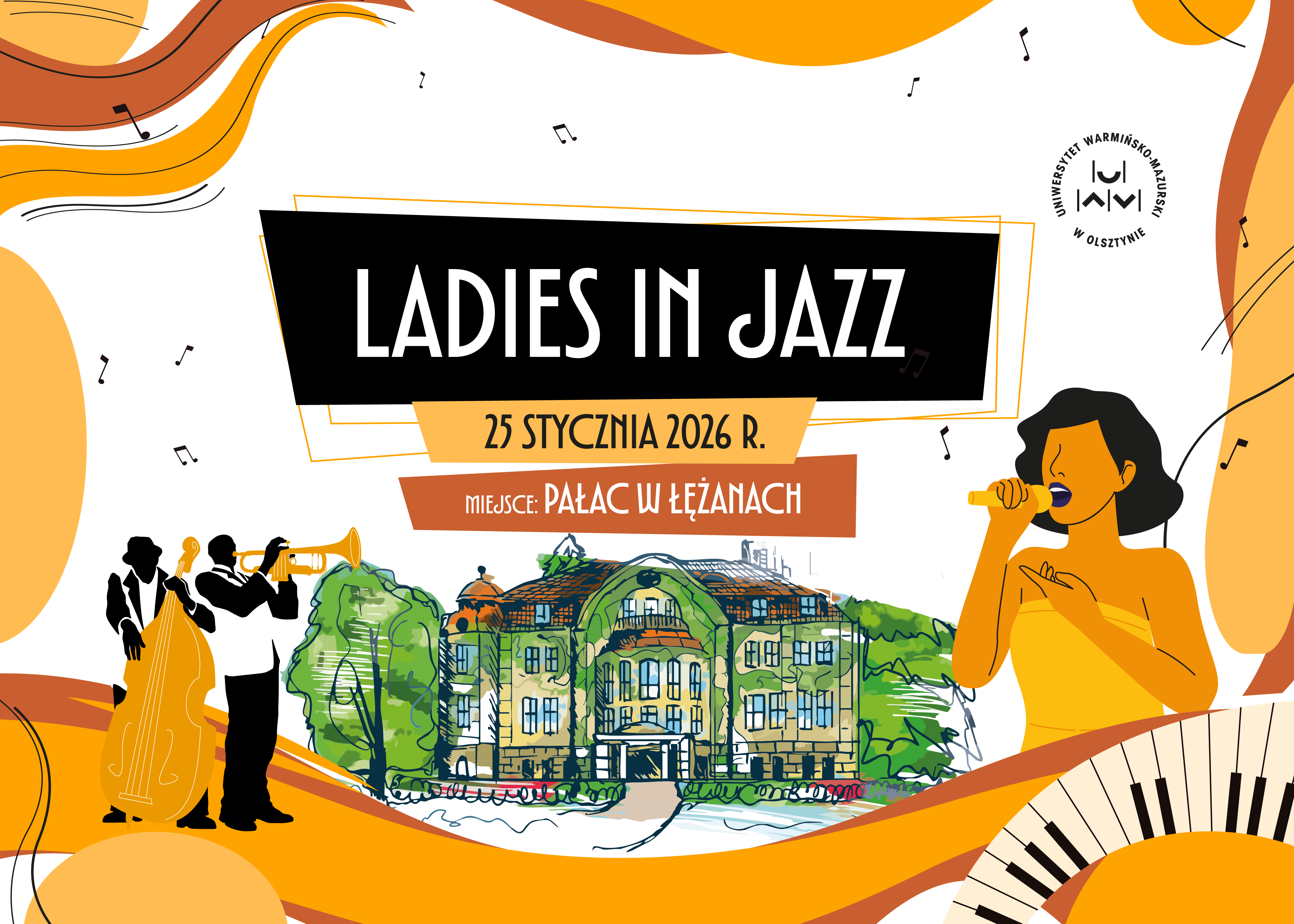 Koncert „Ladies in Jazz. Klasyka i nowe brzmienia w pałacowym klimacie" będzie poświęcony największym damom światowego jazzu. W murach tego niezwykle interesującego zabytku zabrzmią utwory takich wokalistek jak Ella Fitzgerald, Nina Simone, Sarah Vaughan czy Amy Winehouse. Wykona je mgr Patrycja Kunert z Instytutu Muzyki Wydziału Sztuki UWM. Towarzyszyć jej będzie instrumentalne trio w składzie: Konrad Żołnierek, Jakub Paulski i Tymoteusz Ławrukajtis. Klasyczne brzmienia w świeżych aranżacjach wypełnią pałacową przestrzeń energią, która sprawi, że będzie to niezapomniany wieczór.