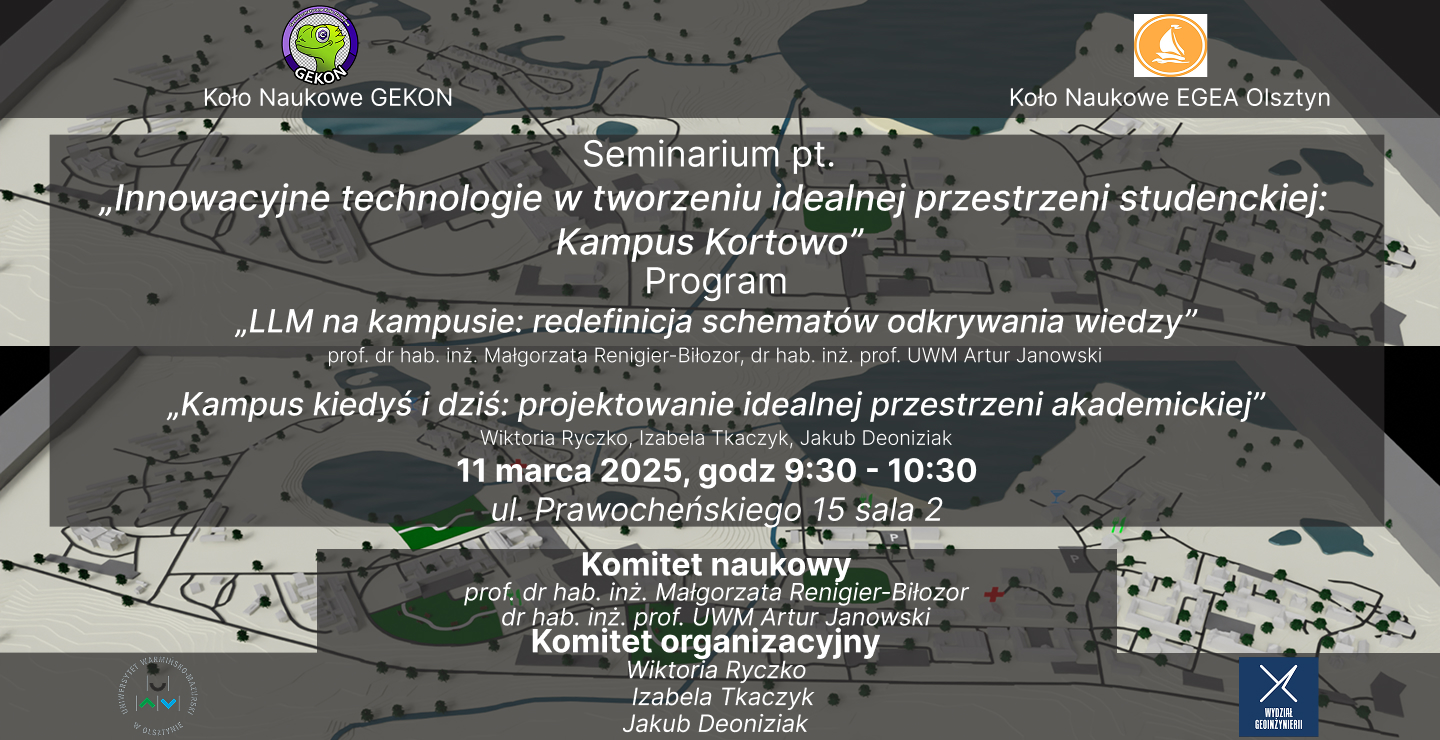 Geoinformatyczne Koło Naukowe GEKON oraz Koło Naukowe EGEA Olsztyn działające na Wydziale Geoinżynierii UWM zapraszają na seminarium naukowe o innowacyjnych technologiach w tworzeniu idealnej przestrzeni studenckiej na przykładzie Kortowa.