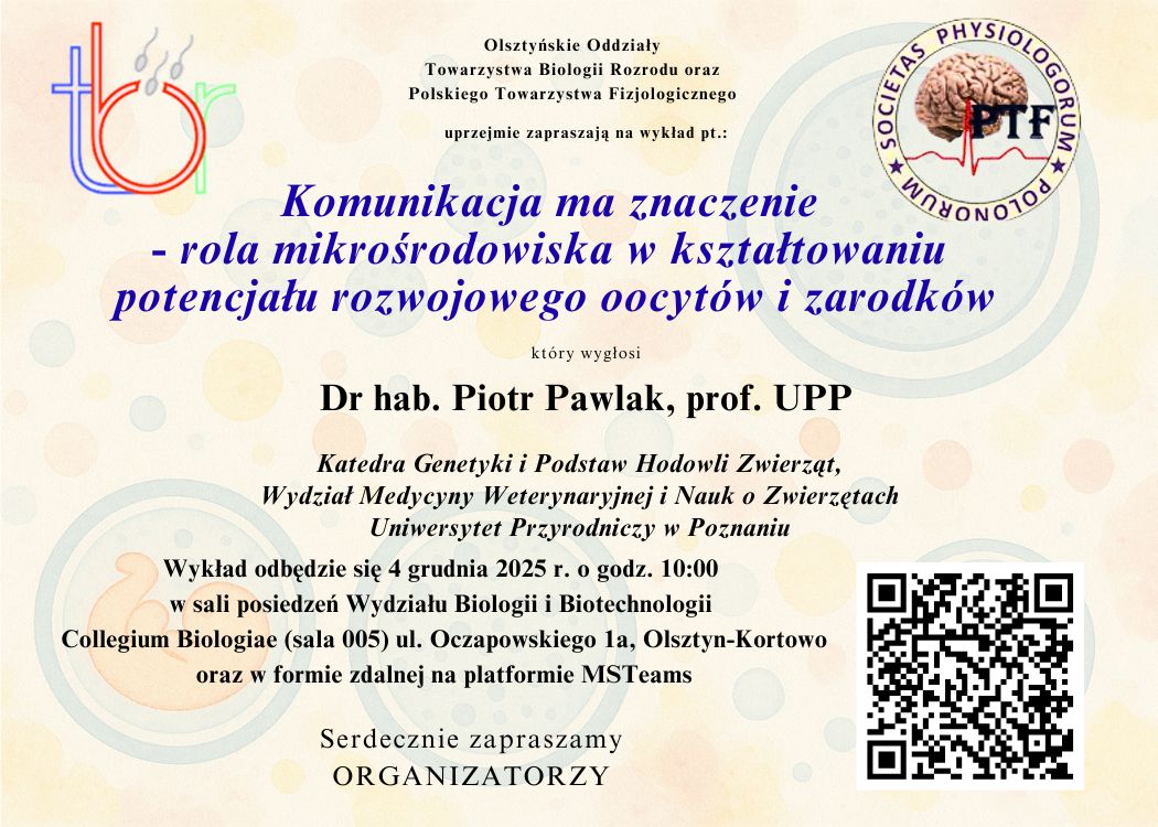 Wykład odbędzie się 4 grudnia o godz. 10:00 w sali posiedzeń Wydziału Biologii i Biotechnologii Collegium Biologiae UWM w sali 005 (ul. Oczapowskiego 1a, Olsztyn-Kortowo) oraz w formie zdalnej na platformie MSTeams.