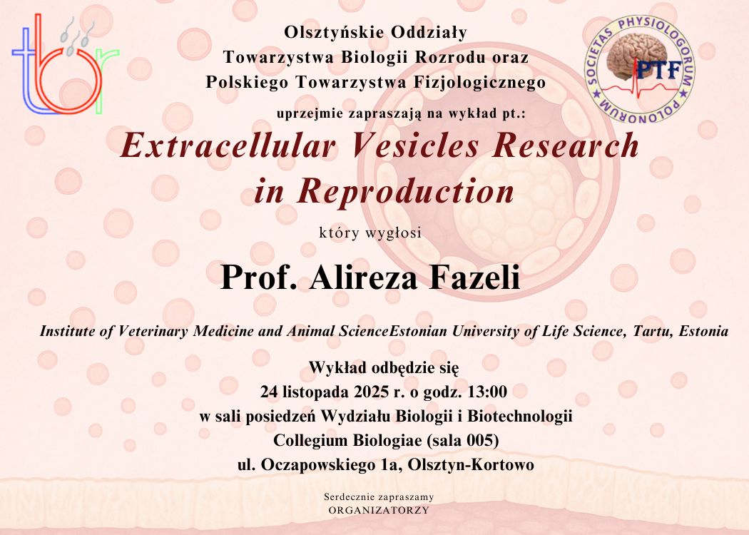 Prof. Alireza Fazeli z Institute of Veterinary Medicine and Animal ScienceEstonian University of Life Science, Tartu w Estonii wygłosi wykład pt.: „Extracellular Vesicles Research in Reproduction". Profesor Alireza Fazeli ma ponad 20-letnie doświadczenie w prowadzeniu interdyscyplinarnych badań w czołowych ośrodkach naukowych na świecie. Specjalizuje się w wykorzystaniu technologii omics, m.in. genomiki i proteomiki, w badaniach translacyjnych dotyczących układu odpornościowego, rozrodu i rozwoju. Koncentruje się na wpływie środowiska okołozapłodnieniowego na epigenetyczny profil potomstwa, interakcjach matczynych z gametami i zarodkami oraz na mechanizmach regulujących wrodzoną odporność w żeńskim układzie rozrodczym w zdrowiu i chorobie.