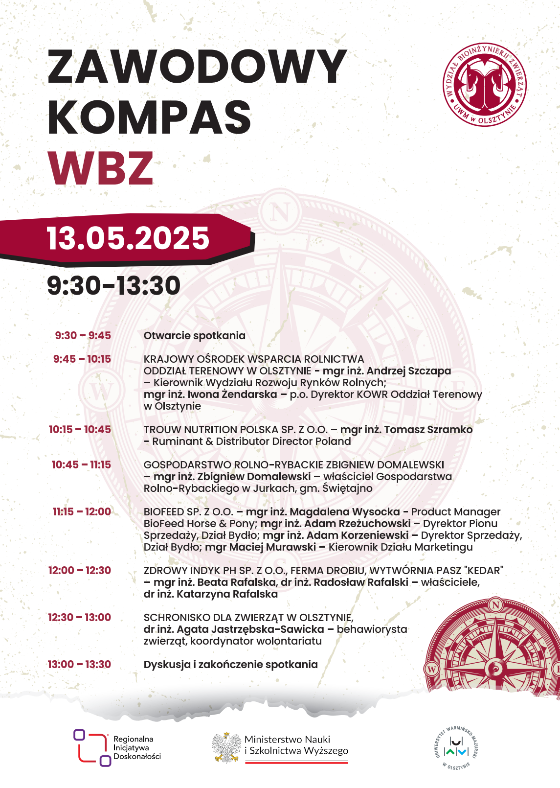 Wydział Bioinżynierii Zwierząt zaprasza pracowników i studentów 13 maja w godz. 9:30-13:30 dna kolejne spotkanie z cyklu: Zawodowy kompas WBZ. To unikalna okazją spotkania i wymiany doświadczeń społeczności akademickiej Wydziału Bioinżynierii Zwierząt z przedstawicielami otoczenia społeczno-gospodarczego.