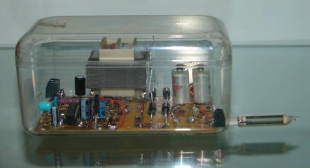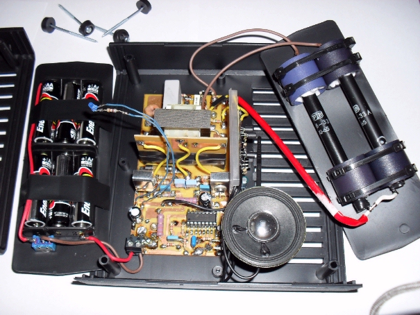 W wolnej chwili przerobiłem stary detektor, uzupełniając go o czulsze lampy GM: BOB-33A. Neonówkę zastąpiłem wzmacniaczem i głośniczkiem, a ośmiowatowe trafo - dwuwatowym. Dołożyłem też stabilizację napięcia wyjściowego. Układ napędzany jest sześcioma paluszkami AA. Bierze sporo prądu (aż 160 mA, blachy trafa nie znoszą większych częstotliwości), ale ponieważ detekcję planuję prowadzić w sposób chwilowy (kilkanaście-kilkadziesiąt sekund na pomiar), więc bateria paluszków powinna wystarczyć na jakiś czas. Łowy promieniowania w terenie zbliżają się wielkimi krokami :)