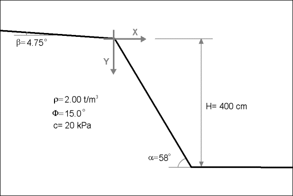 Oznaczenia w programie: a=4.75°, b=58°, F =15°, c=20kPa, g=2.0 t/m3*9.81m/s2, H=4m.
