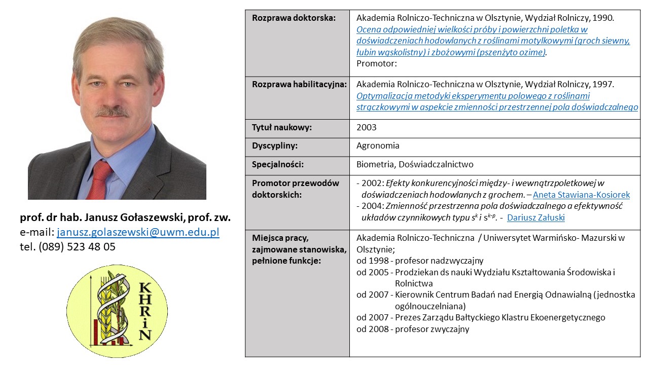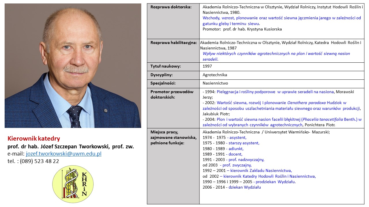 In 2001, as part of internal restructuring, the Faculty of Environmental Management and Agriculture abandoned the division of Departments into Facilities. Since 2002, the head of the Department of Plant Breeding and Seed Production is prof. dr hab. Józef Tworkowski (in the picture below). Currently, in the Department are working 6 professors, 6 adjuncts, 5 engineering and technical staff and 6 PhD students.