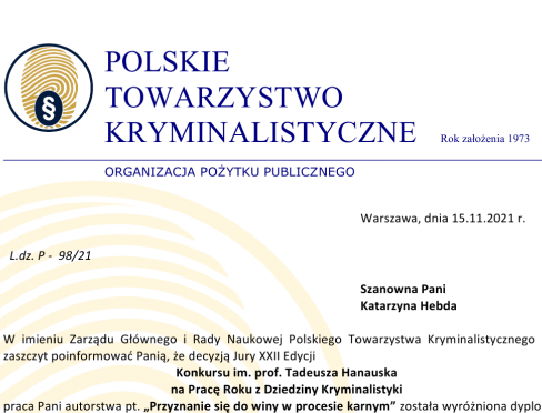 17/11/2021Decyzją Jury XXII Edycji Konkursu im. prof. Tadeusza Hanauska na Pracę Roku z Dziedziny Kryminalistyki praca Pani Doktor Katarzyny Hebdy pt. "Przyznanie sie do winy w procesie karnym" (promotor pracy - dr hab. Denis Solodov, prof. UWM) została wyrózniona dypołomem i nagrodą Polskiego Towarzystwa Kryminalistycznego w kategorii - prace doktorskie.