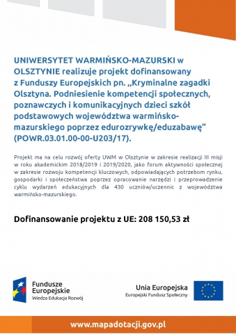 Projekt „Kryminalne zagadki Olsztyna. Podniesienie kompetencji społecznych, poznawczych i komunikacyjnych dzieci szkół podstawowych województwa warmińsko-mazurskiego poprzez edurozrywkę/eduzabawę” (POWR.03.01.00-00-U203/17), realizowany przez Uniwersytet Warmińsko-Mazurski w Olsztynie, współfinansowany ze środków Unii Europejskiej w ramach Europejskiego Funduszu Społecznego.