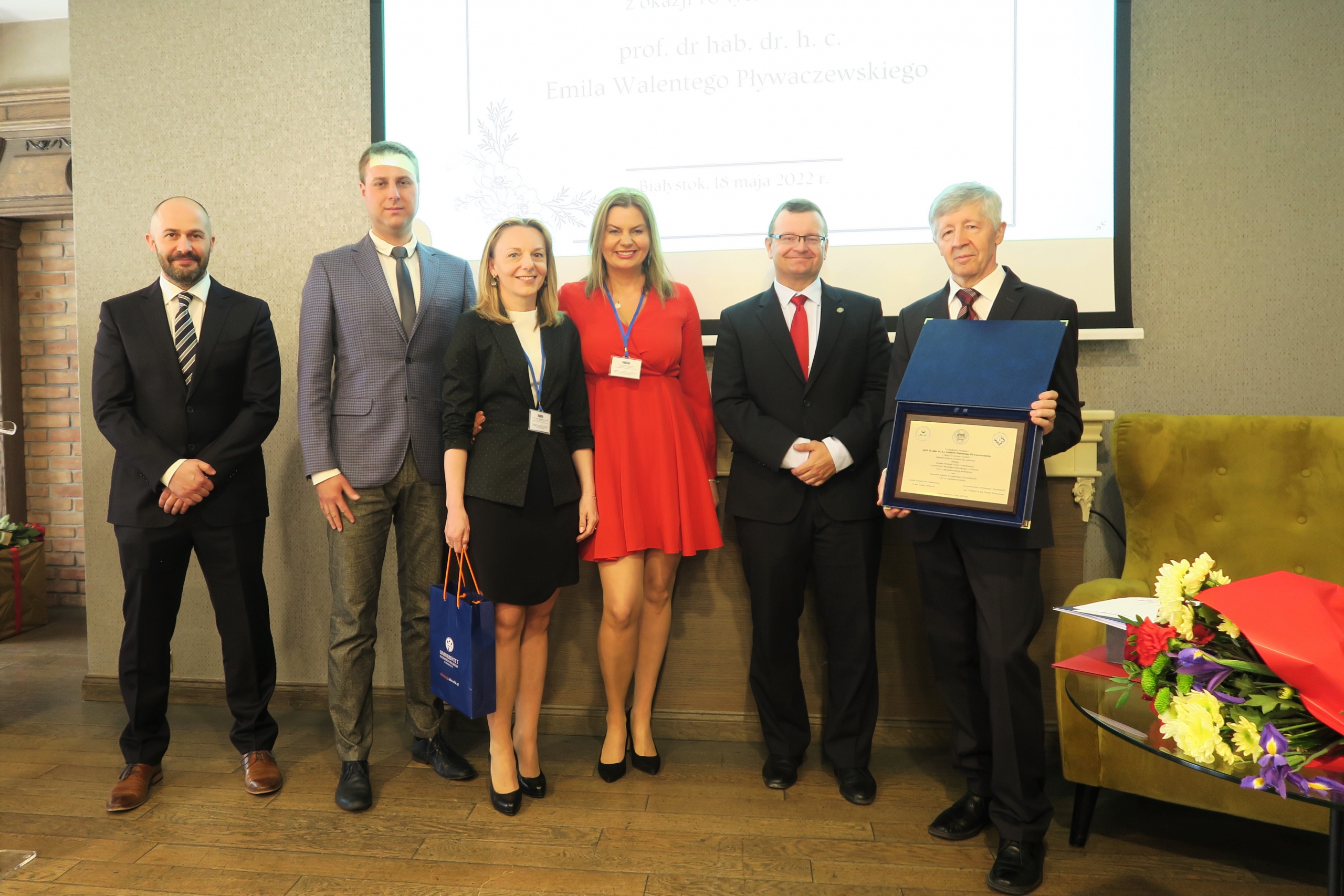 W dniu 18 maja 2022 roku na Wydziale Prawa Uniwersytetu w Białymstoku odbył się Jubileusz 70. urodzin prof. dr. hab. dr. h.c. Emila Walentego Pływaczewskiego. Podkreślić należy, iż Jubilat, światowej sławy kryminolog, jest również Doktorem Honoris Causa Uniwersytetu Warmińsko-Mazurskiego w Olsztynie. W uroczystościach jubileuszowych wzięła udział delegacja Wydziału Prawa i Administracji UWM. Kolegium Dziekańskie reprezentował dr hab. Jakub Zięty, prof. UWM – Prodziekan ds. Rozwoju. Obecni byli również przedstawiciele wszystkich katedr nauk penalnych. Katedrę Kryminologii i Kryminalistyki reprezentowali: prof. dr hab. Wiesław Pływaczewski, dr hab. Monika Kotowska, dr hab. Aneta Łyżwa, dr Joanna Narodowska, dr Maciej Duda oraz doktoranci (mgr Szymon Buczyński, mgr Natalia Dąbkowska). W imieniu Katedry Prawa Karnego i Prawa Wykroczeń gratulacje złożyli dr hab. Marta Romańczuk-Grącka i dr Michał Kurzyński. Obecna była również Kierownik Katedry Postępowania Karnego i Prawa Karnego Wykonawczego – dr hab. Krystyna Szczechowicz, prof. UWM. Pracownicy WPiA UWM wręczyli Jubilatowi pamiątkowy grawer i kwiaty od społeczności akademickiej WPiA UWM oraz wygłosili okolicznościowe adresy. W swoich podziękowaniach Jubilat podkreślił wieloletnią, owocną, twórczą i wzajemnie inspirującą współpracę białostockiego i olsztyńskiego środowiska naukowego.