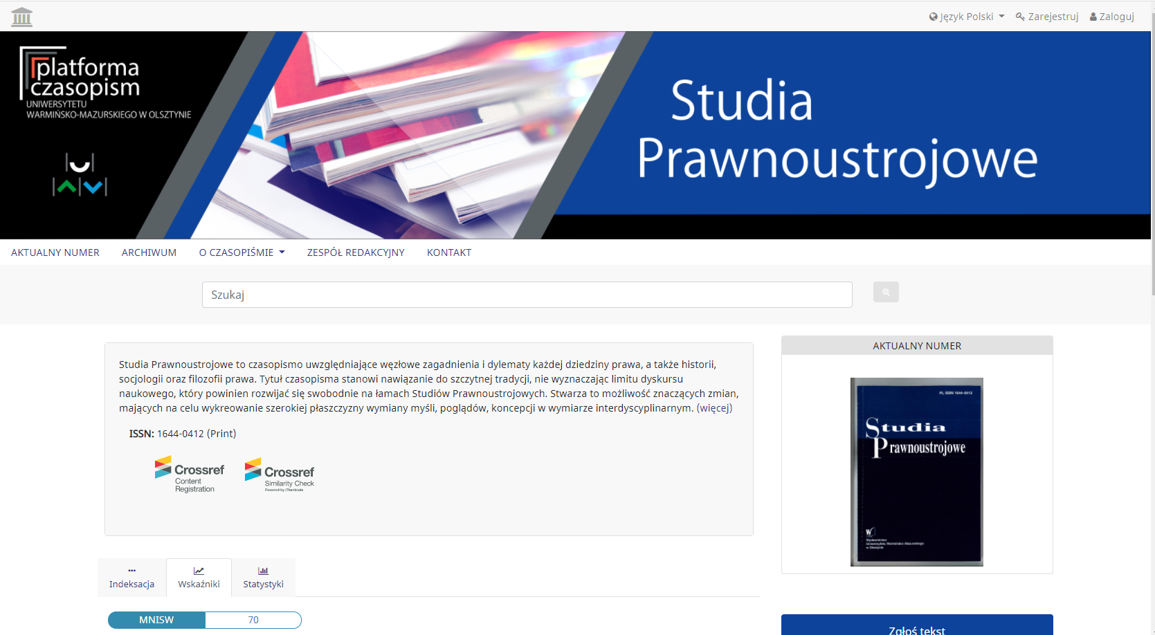 Studia Prawnoustrojowe z 70 pkt. na liście MNiSW! Z przyjemnościa informujemy, że nasze wydziałowe czasopismo Studia Prawnoustrojowe uzyskało 70 punktów w wykazie czasopism naukowych MNiSW. Serdecznie gratułujemy Panu Dziekanowi i Redakcji!