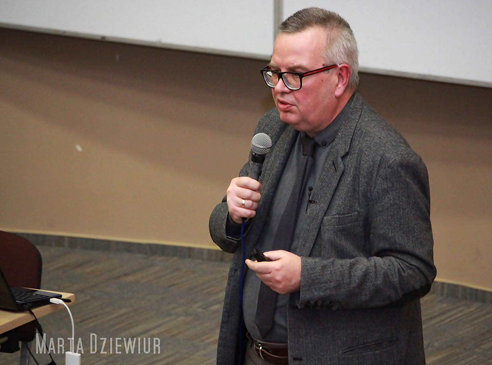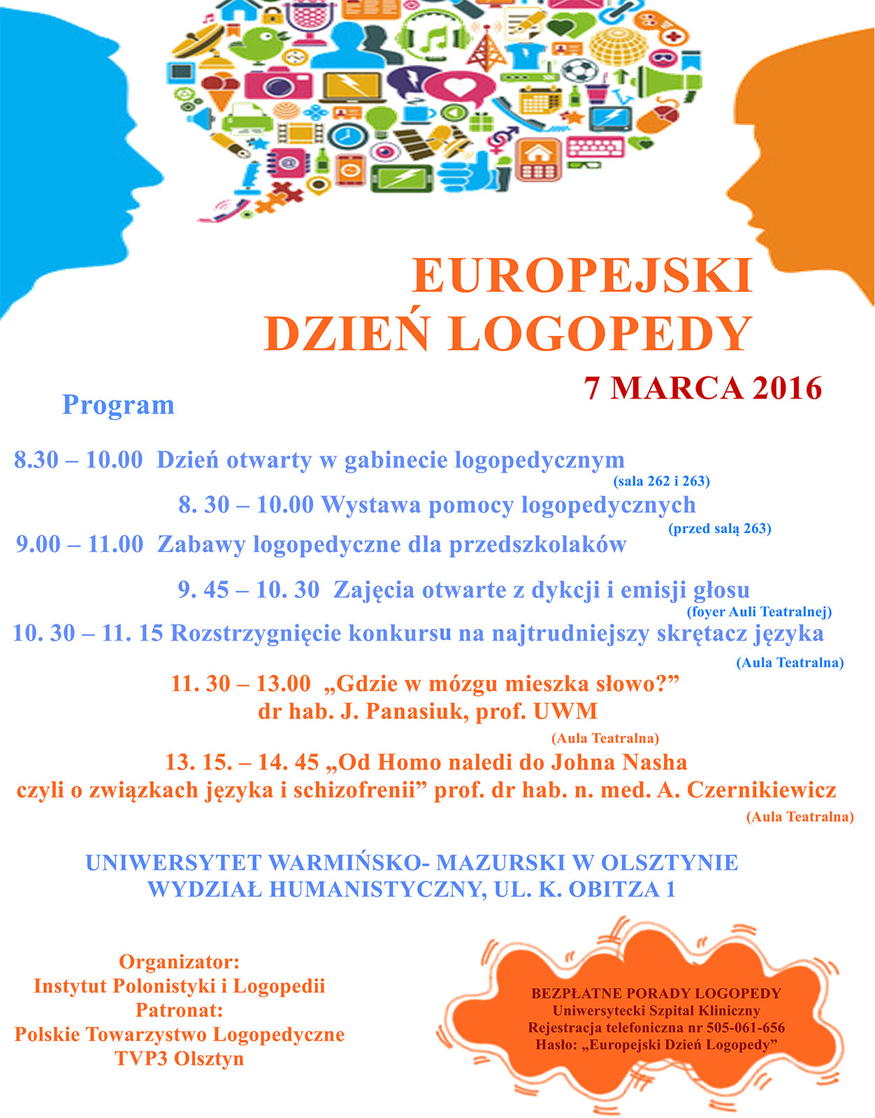 Już drugi raz na Wydziale Humanistycznym obchodziliśmy Europejski Dzień Logopedy. 7 marca obchody tego święta przygotował Instytut Polonistyki i Logopedii pod patronatem Polskiego Towarzystwa Logopedycznego oraz TVP3. Program imprezy był ciekawy i niezwykle bogaty. Wszystko rozpoczęło się już o 7. 15 w telewizji regionalnej. Dr Magdalena Osowicka-Kondratowicz, główna organizatorka całego wydarzenia, wraz ze studentką drugiego roku logopedii Pauliną Łoszewską były gośćmi „Poranka TVP3”. Na Wydziale Humanistycznym obchody otworzył dzień otwarty w gabinecie logopedycznym. Studentki drugiego roku logopedii Dominika Kalinowska, Kornelia Jackiewicz, Magdalena Kondracka oraz Kamila Zajko, pod opieką zawodowego logopedy mgr Beaty Mikitiuk, przeprowadziły diagnozę logopedyczną kilkorga dzieci, a zgromadzona publiczność mogła to obserwować przez lustro weneckie. Przyszłe logopedki popisały się nabytym w trakcie studiów warsztatem oraz umiejętnością nawiązania świetnego kontaktu z małymi pacjentami, a dzieci wychodziły zadowolone i pod wrażeniem atmosfery panującej w gabinecie. Równocześnie odbywała się wystawa pomocy logopedycznych autorstwa studentów logopedii. Ekspozycję przygotowały Panie Agata Jankowicz i Izabela Kaczmarczyk. Okazało się, że studenci mają nie tylko ciekawe pomysły na stworzenie takich pomocy, ale również żyłkę artystyczną do ich wykonania. Ogromną popularnością cieszyły się również zabawy logopedyczne dla przedszkolaków. Przygotowały je i przeprowadziły studentki: Joanna Gromotowicz, Marta Dziewiur, Angelika Małkiewicz, Edyta Kiedrowska, Izabela Romanowska, Wioletta Lebieusz, Alicja Omelańczuk, Magdalena Noszczak, Aleksandra Bandura, Marta Szukszta, Anna Sokyra i Anna Skomorucha. Na zabawy przybyły dwie grupy przedszkolaków z dwóch przedszkoli. Studentki podzieliły każdą z grup na trzy podgrupy i samodzielnie poprowadziły warsztaty w trzech specjalnie do tego przygotowanych salach – do ćwiczeń oddechowych, do ćwiczeń artykulacyjnych i do ćwiczeń ruchowych. Dzieci wyszły zadowolone, pozostawiając piękne laurki w ramach podziękowania. Równolegle odbywały się zajęcia otwarte z dykcji i emisji głosu prowadzone przez dr Magdalenę Zaorską, w których brali udział studenci pierwszego roku logopedii. Zgromadzona publiczność miała możliwość obserwowania, jak przyszli logopedzi pracują nad głosem i wymową, łącząc ruch, oddech i artykulację. Po zajęciach rozstrzygnięto konkurs na najtrudniejszy skrętacz języka (więcej na ten temat w zakładce FINAŁOWE SKRĘTACZE 2016). Następnie licznie zgromadzona publiczność wysłuchała prezentacji dr hab. Jolanty Panasiuk, prof. UWM „Gdzie w mózgu mieszka słowo?”. Pani Profesor bardzo ciekawie opowiadała o różnych koncepcjach lokalizacji języka w mózgu oraz o tym, że język jest oknem, poprzez które można podglądać pracę mózgu. Zwieńczeniem imprezy był wykład otwarty prof. dr hab. n. med. Andrzeja Czernikiewicza „Od Homo naledi do Johna Nasha - czyli o związkach języka i schizofrenii”, z którego dowiedzieliśmy się, że schizofrenia to cena, jaką gatunek ludzki płaci za język. Wykład był bardzo interesujący. Profesor podawał wiele przykładów różnych fenomenów językowych w schizofrenii, obrazując w ten sposób związki między medycyną a logopedią i językoznawstwem. Profesor mówił ze swadą, w sposób dowcipny i zrozumiały. Wykład dostępny był online na stronach uniwersytetu. Oba wykłady, podobnie jak cała impreza, cieszyły się ogromnym zainteresowaniem. Przybyła publiczność, nie tylko wykładowcy i studenci wielu kierunków, ale również sporo osób spoza uczelni, w tym zawodowi logopedzi, ledwo zmieściła się w auli teatralnej, tak że trzeba było zajmować miejsca również na schodach i scenie, co niezmiernie ucieszyło organizatorów. Obchody odbyły się nie tylko na wydziale, ale również we współpracy z Uniwersyteckim Szpitalem Klinicznym, gdzie w ramach imprezy towarzyszącej zorganizowano darmowe konsultacje z neurologopedami dla dzieci i dorosłych na hasło „Europejski Dzień Logopedy”.