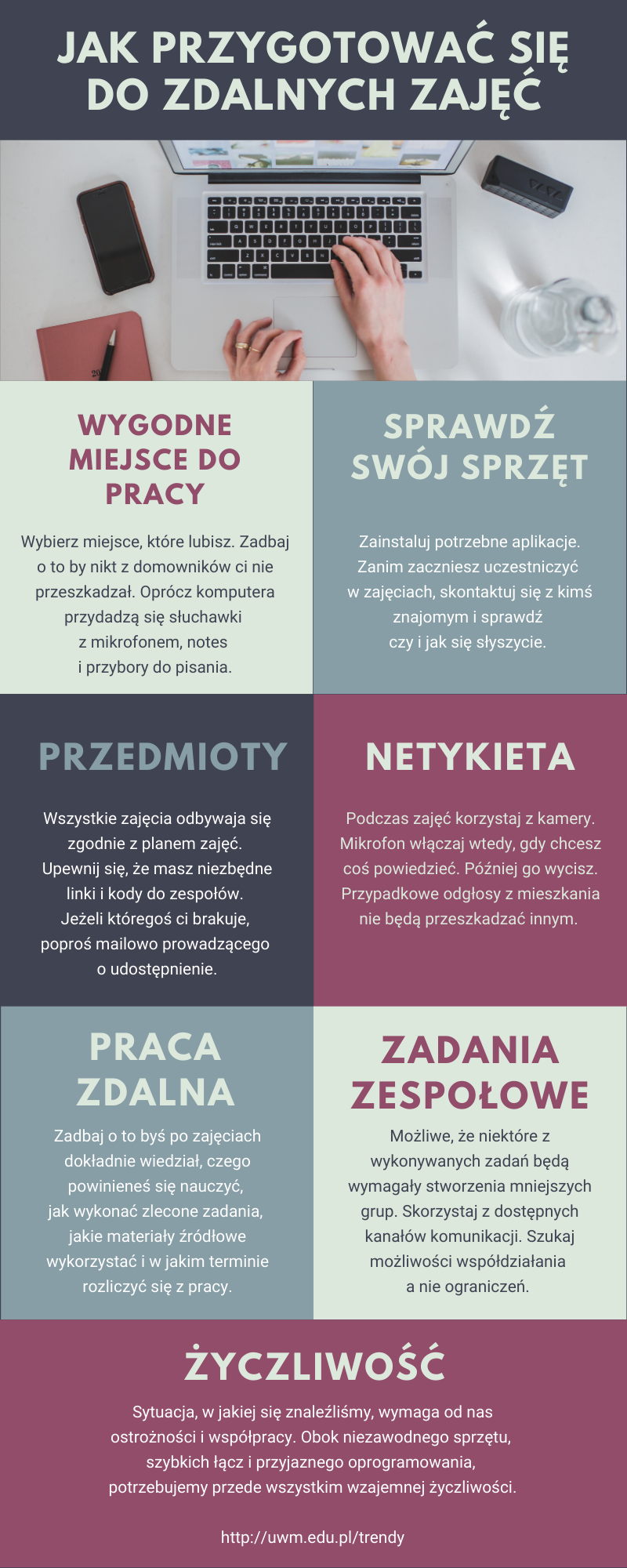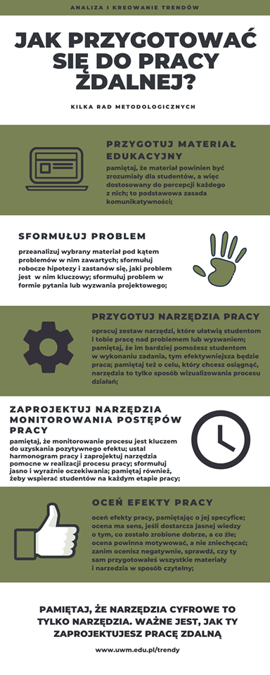 Za względu na konieczność podzielenia grup ćwiczeniowych na mniejsze na zajęciach z technologii informacyjnych, studenci I roku analizy i kreowania trendów są proszeni o bezpośredni kontakt z mgr Izabelą Socką i zapisy u prowadzącej zajęcia (tel. 089 524 64 75, e-mail: izabela.socka@uwm.edu.pl, Centrum Nauk Humanistycznych, pok. 107 c).