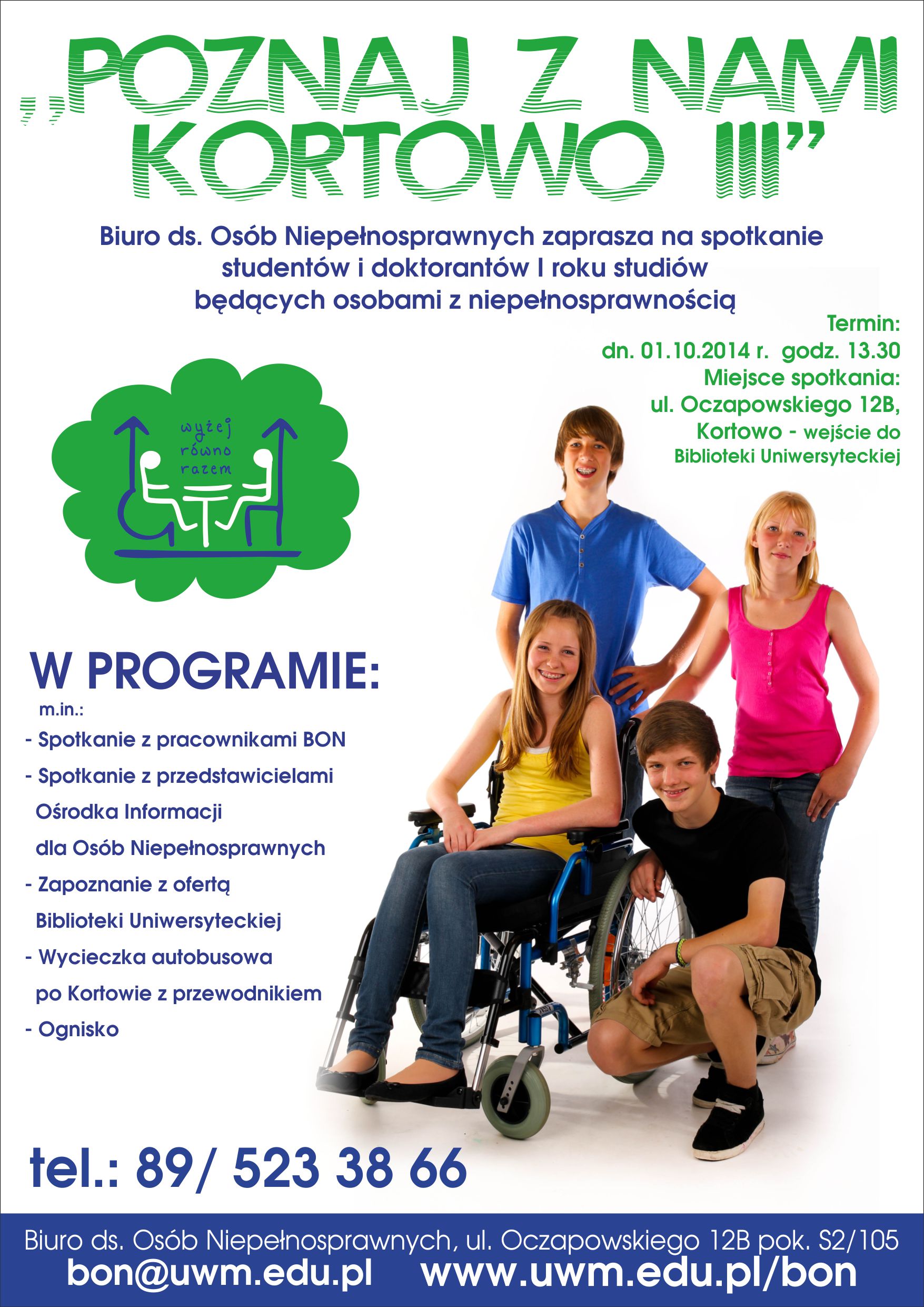 Biuro ds. Osób Niepełnosprawnych serdecznie zaprasza wszystkich studentów i doktorantów niepełnosprawnych, którzy w roku akademickim 2014/2015 rozpoczynają naukę na Uniwersytecie Warmińsko-Mazurskim w Olsztynie, na spotkanie pt.: „POZNAJ Z NAMI KORTOWO", które odbędzie się 01.10.2014 r. o godz. 13.30.