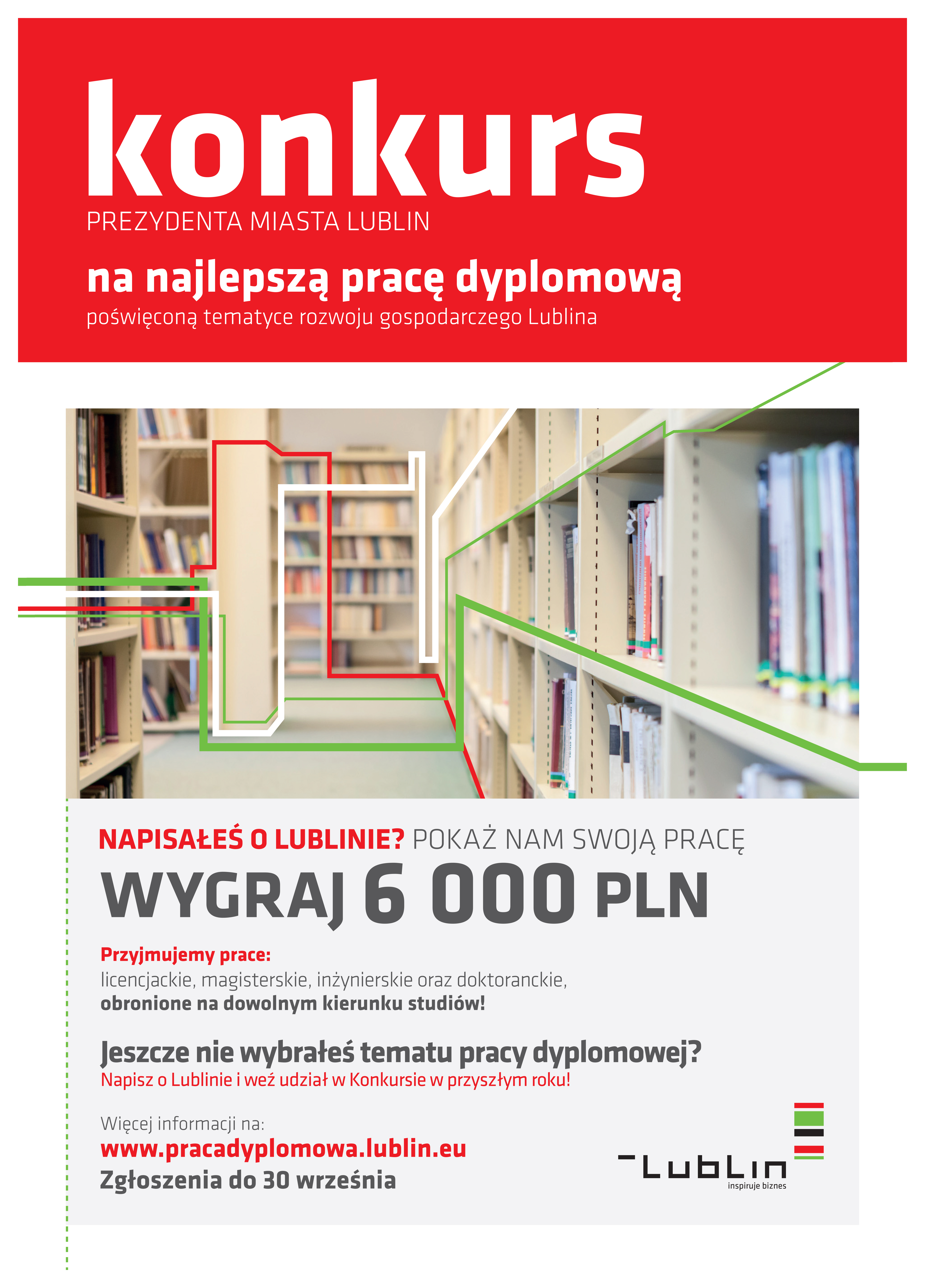 Trwa nabór do piątej edycji Konkursu Prezydenta Miasta Lublin na najlepszą pracę dyplomową poświęconą rozwojowi gospodarczemu miasta. Jeśli jesteś absolwentem, który opisał w jaki sposób Miasto Lublin wspiera rozwój przedsiębiorczości oraz podnosi swój poziom konkurencyjności koniecznie zgłoś się do konkursu!