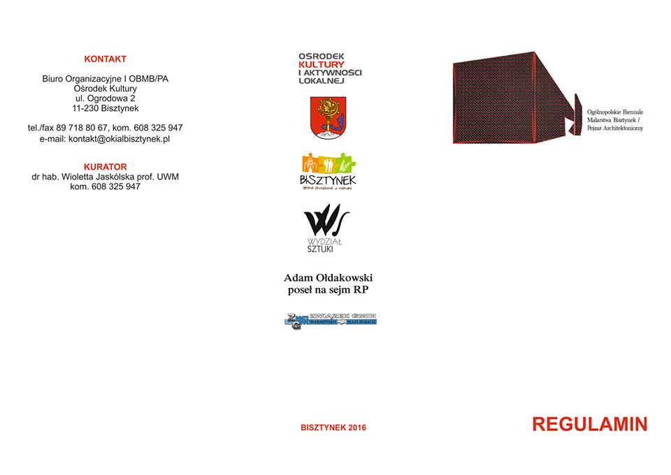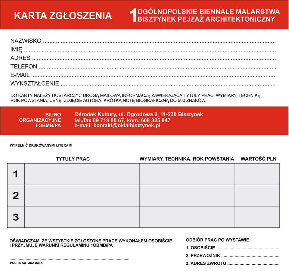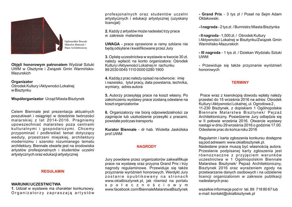 Zapraszamy wszystkich profesjonalnych artystów oraz studentów uczelni artystycznych (którzy uzyskali dyplom licencjata) do udziału w Ogólnopolskim Biennale Malarstwa Bisztynek. Tematem przewodnim jest pejzaż architektoniczny, którego zadaniem jest przypomnienie i podkreslenie tematów takich jak weduta, przestrzeń miejska, architektura modernizmu oraz szeroko rozumiana architektura. Celem Biennale jest prezentacja aktualnych poszukiwań i osiagnięć w dziedzinie twórczości malarskiej na przełomie 2014- 2016 roku.