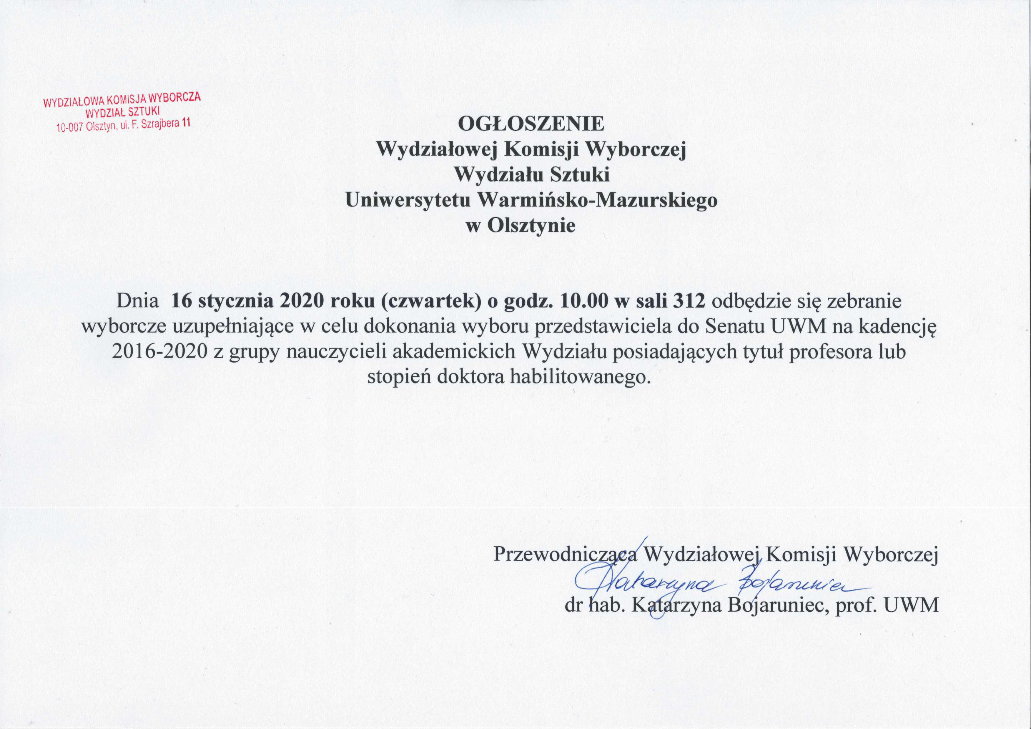 Dnia 16 stycznia 2020 roku (czwartek) o godz. 10.00 w sali 312 odbędzie się zebranie wyborcze uzupełniające w celu dokonania wyboru przedstawiciela do Senatu UWM na kadencję 2016 - 2020 z grupy nauczycieli akademickich Wydziału posiadających tytuł profesora lub stopień doktora habilitowanego