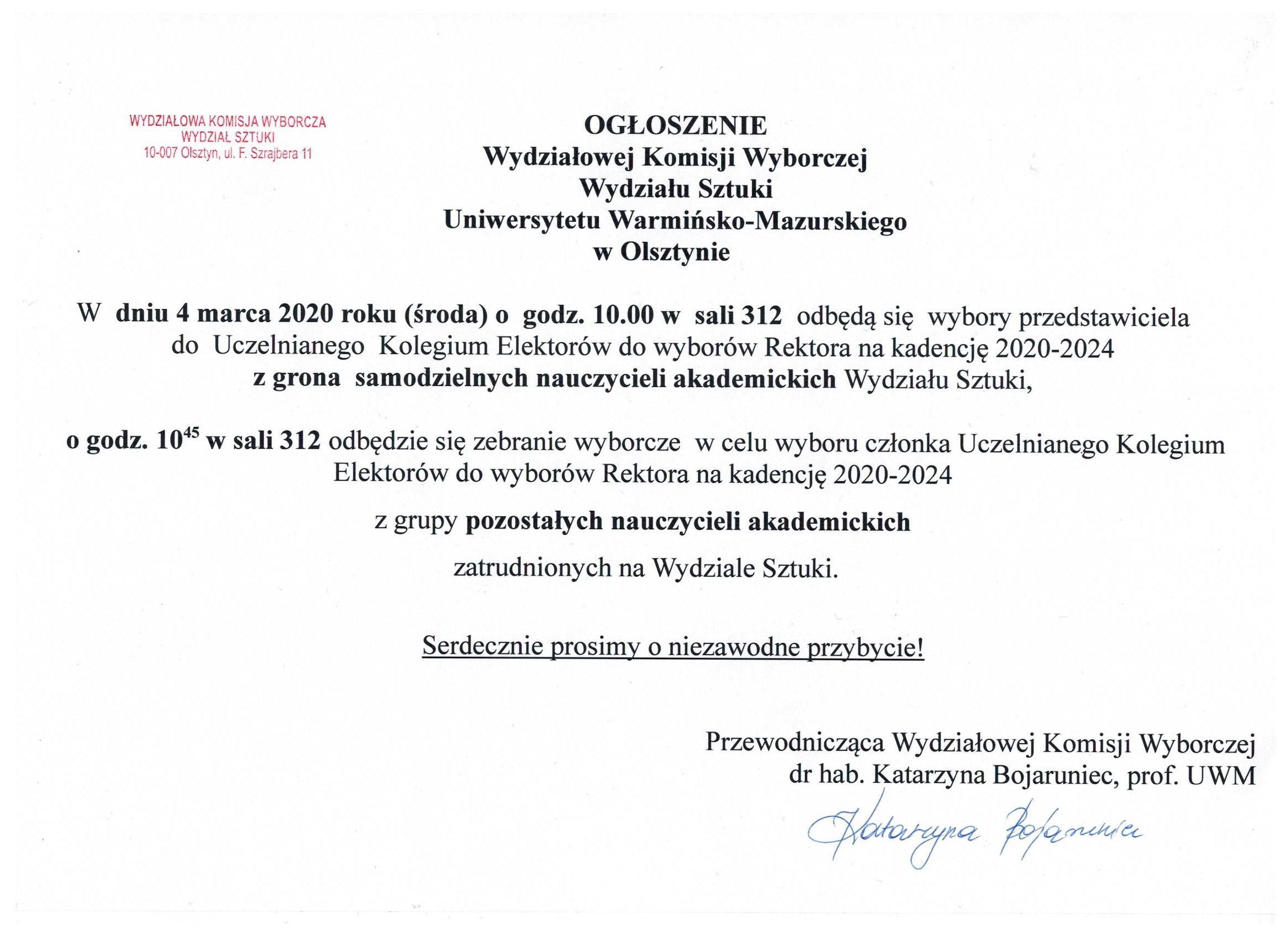 Ogłoszenie Wydziałowej Komisji Wyborczej Wydziału Sztuki UWM