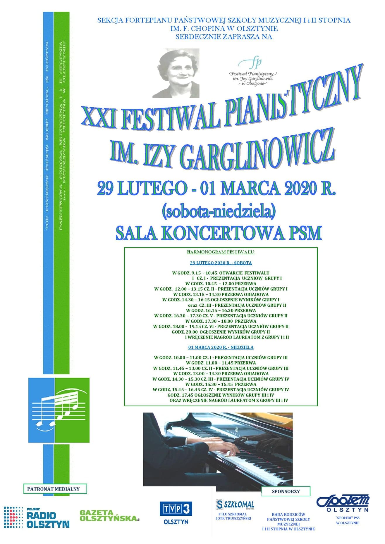 29 lutego - 1 marca 2020r w sali koncertowej Państwowej Szkoły Muzycznej w Olsztynie odbył się XXI Festiwal Pianistyczny im. Izy Garlinowicz. Przewodniczącym jury była dr hab. Zofia Antes.