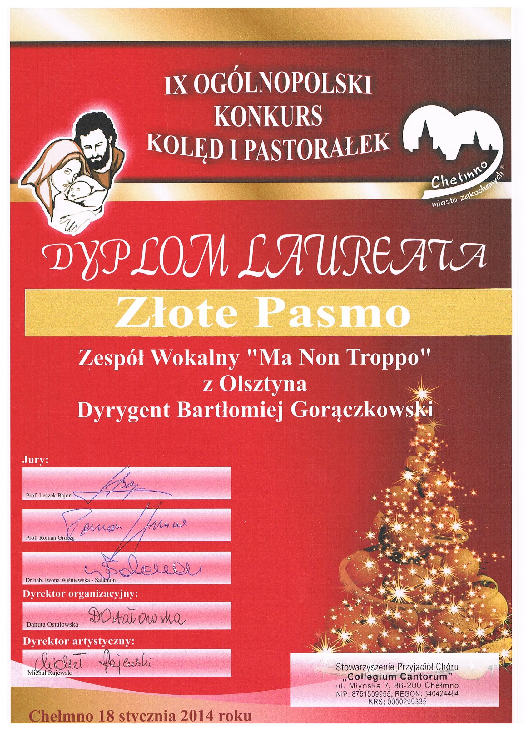 Zgodnie z werdyktem jury, studencki Zespół Wokalny Ma Non Troppo, dyrygent: Bartłomiej Gorączkowski, działający przy Kole Artystyczno-Naukowym Musica Prattica w Instytucie Muzyki pod opieką prof. UWM Marcina Wawruka, otrzymał Złote Pasmo IX Ogólnopolskiego Konkursu Kolęd i Pastorałek w Chełmnie