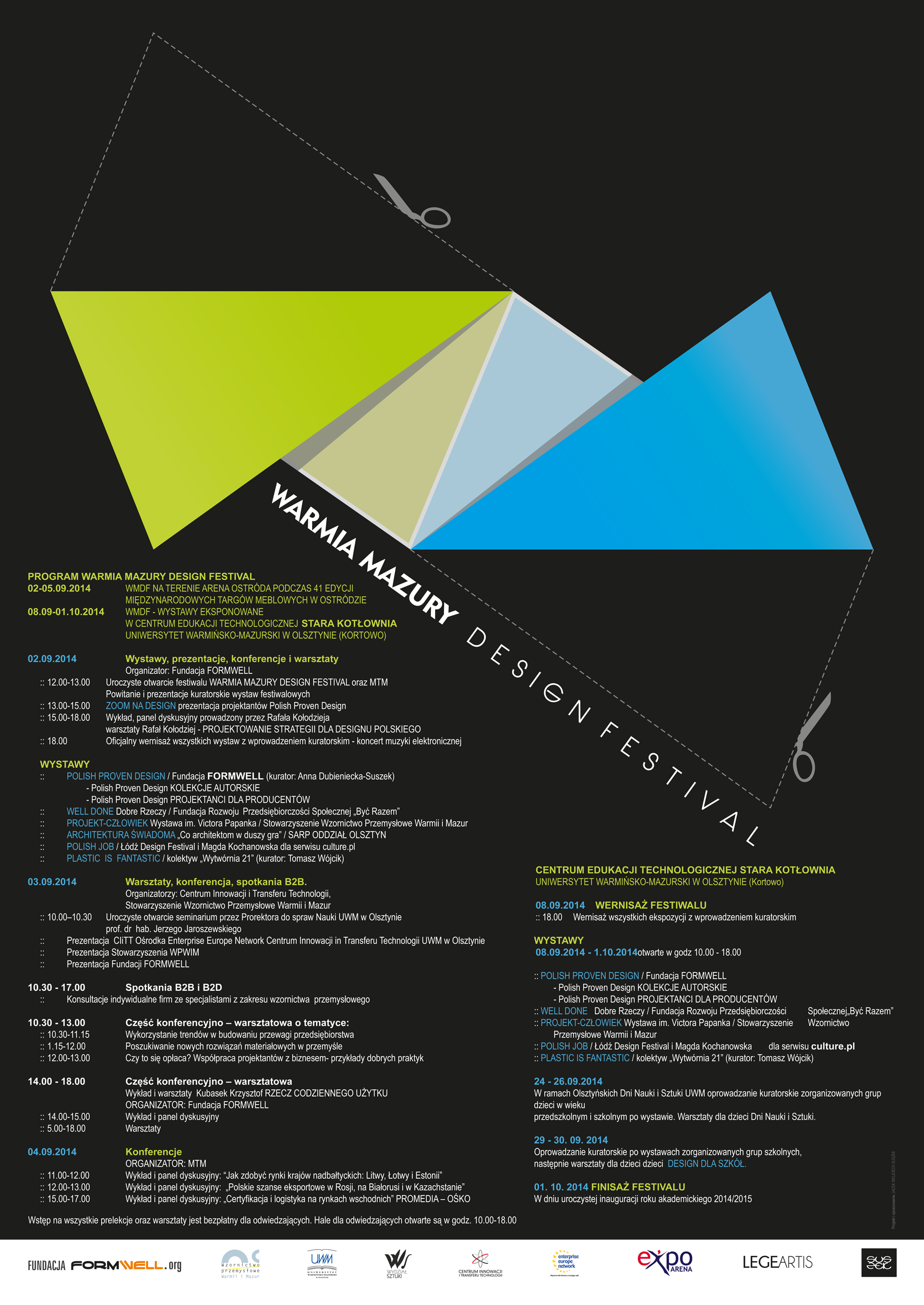 Na Warmia Mazury Design Festiwal przyjedzie sześć wystaw i ponad setka nowatorskich eksponatów z całej Polski! Obejrzymy między innymi POLISH JOB - wystawę przygotowaną przez Łódź Design Festiwal oraz Magdę Kochanowską dla serwisu Culture, która właśnie wróciła z zagranicznych pokazów, zobaczymy też wystawę „Projekt - Człowiek", skupiającą najciekawsze eksponaty sztuki użytkowej z całej Polski, między innymi sofę