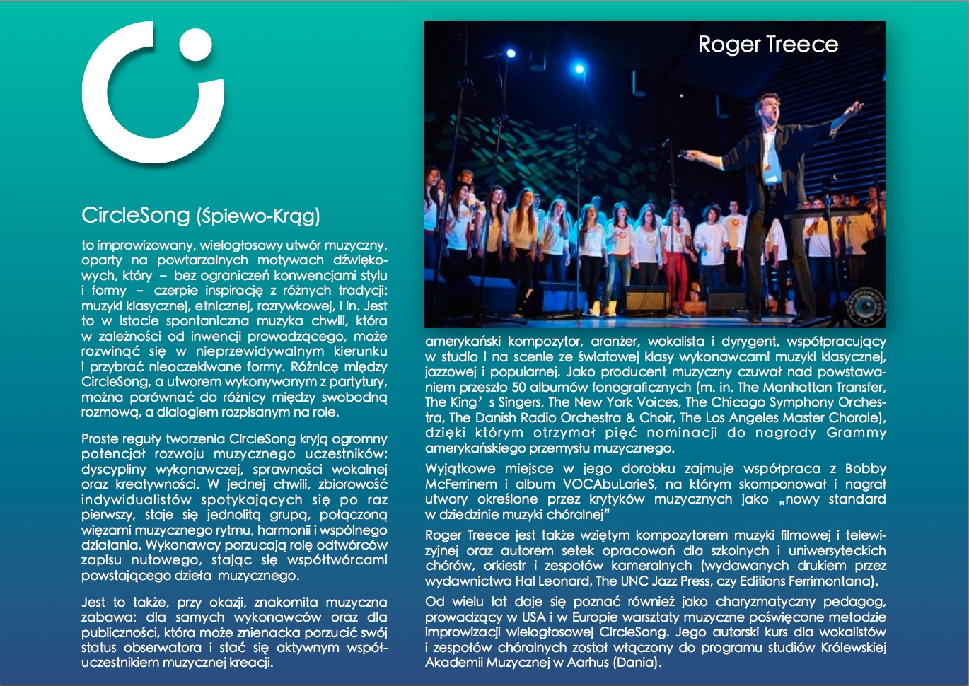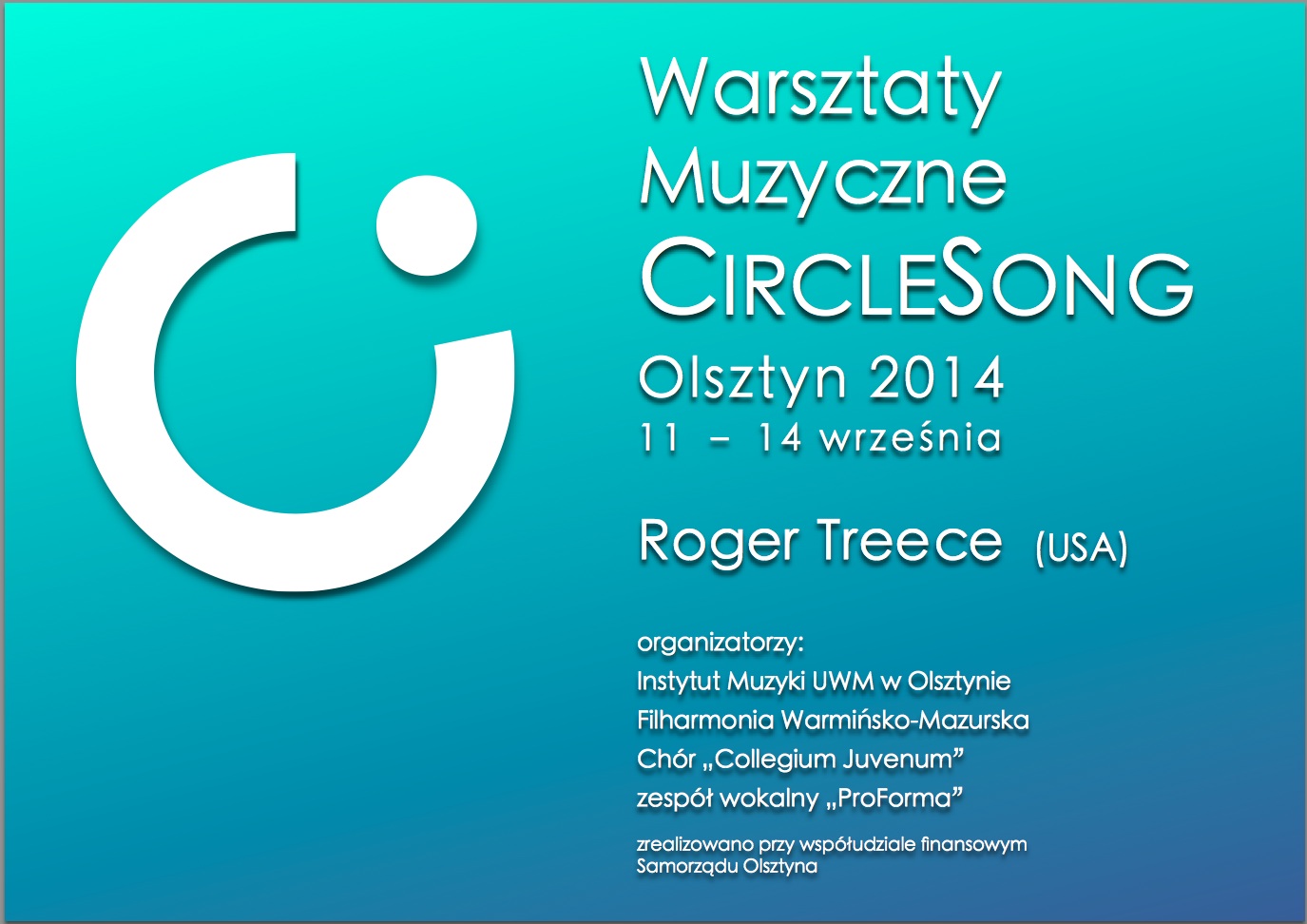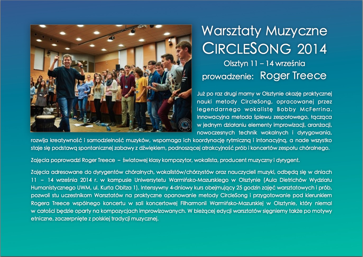 W dniach 11 - 14 września b. r. w kampusie Uniwersytetu Warmińsko-Mazurskiego odbędą się po raz kolejny Warsztaty Muzyczne "CircleSong", prowadzone przez amerykańskiego kompozytora i chórmistrza Rogera Treece. Uczestnicy - dyrygenci, wokaliści i nauczyciele muzyki z kraju i zagranicy - będą szkolić się w innowacyjnej technice improwizacji chóralnej 'circlesong', opracowanej przez legendarnego wokalistę Bobby McFerrina. 4-dniowe warsztaty zakończy improwizowany koncert warsztatowego chóru w Filharmonii Warmińsko-Mazurskiej w Olsztynie (14 września, niedziela, godz. 18:00).