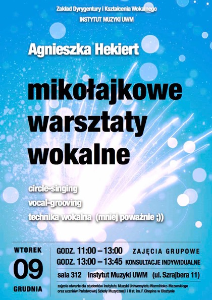 Zakład Dyrygentury i Kształcenia Wokalnego Instytutu Muzyki UWM zaprasza na warsztaty wokalne, prowadzone przez Agnieszkę Hekiert.