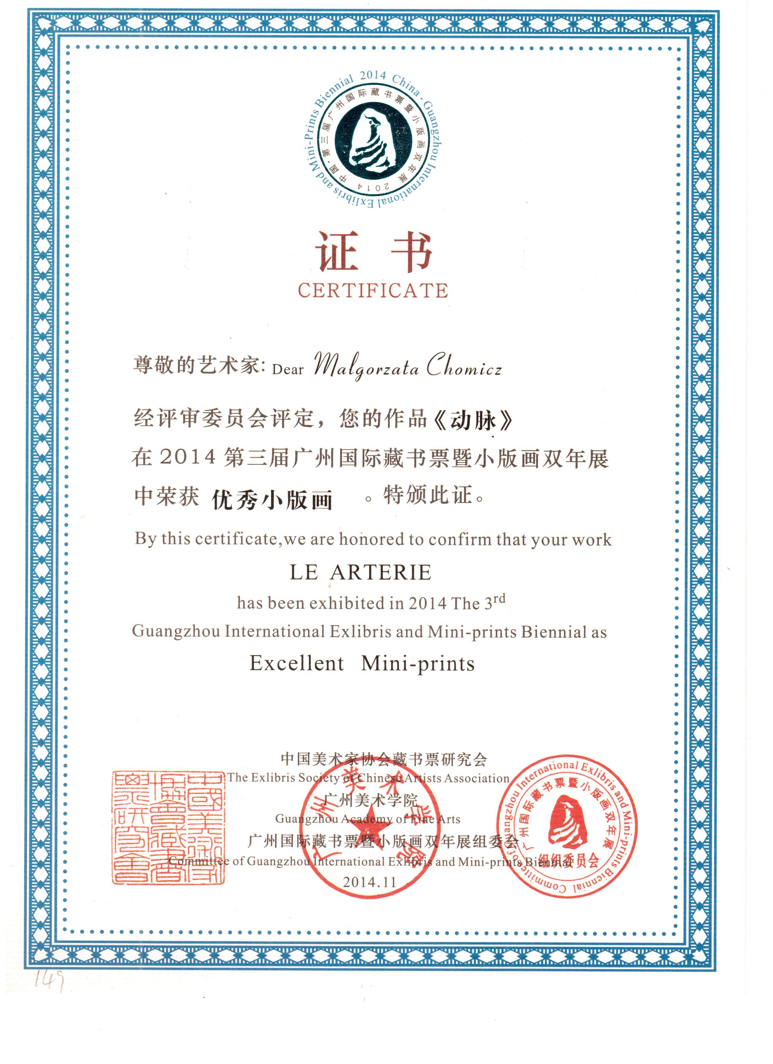 Prace Małgorzaty Chomicz na wystawie Biennale Małych Form Grafiki w Chinach