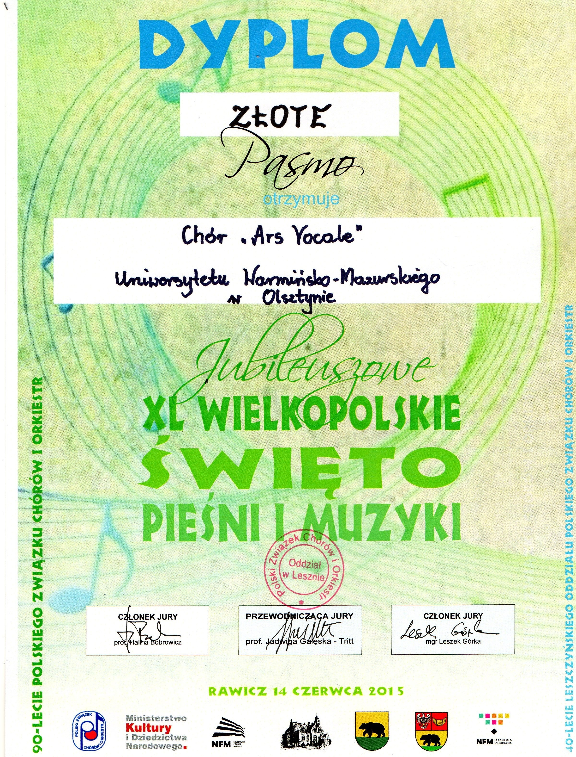 Na XL Jubileuszowym Święcie Pieśni i Muzyki w Rawiczu w dniu 14 czerwca 2015 r. chór mieszany Instytutu Muzyki Ars Vocale pod dyrekcją dr hab. Katarzyny Bojaruniec prof. UWM zdobył Dyplom Złotego Pasma