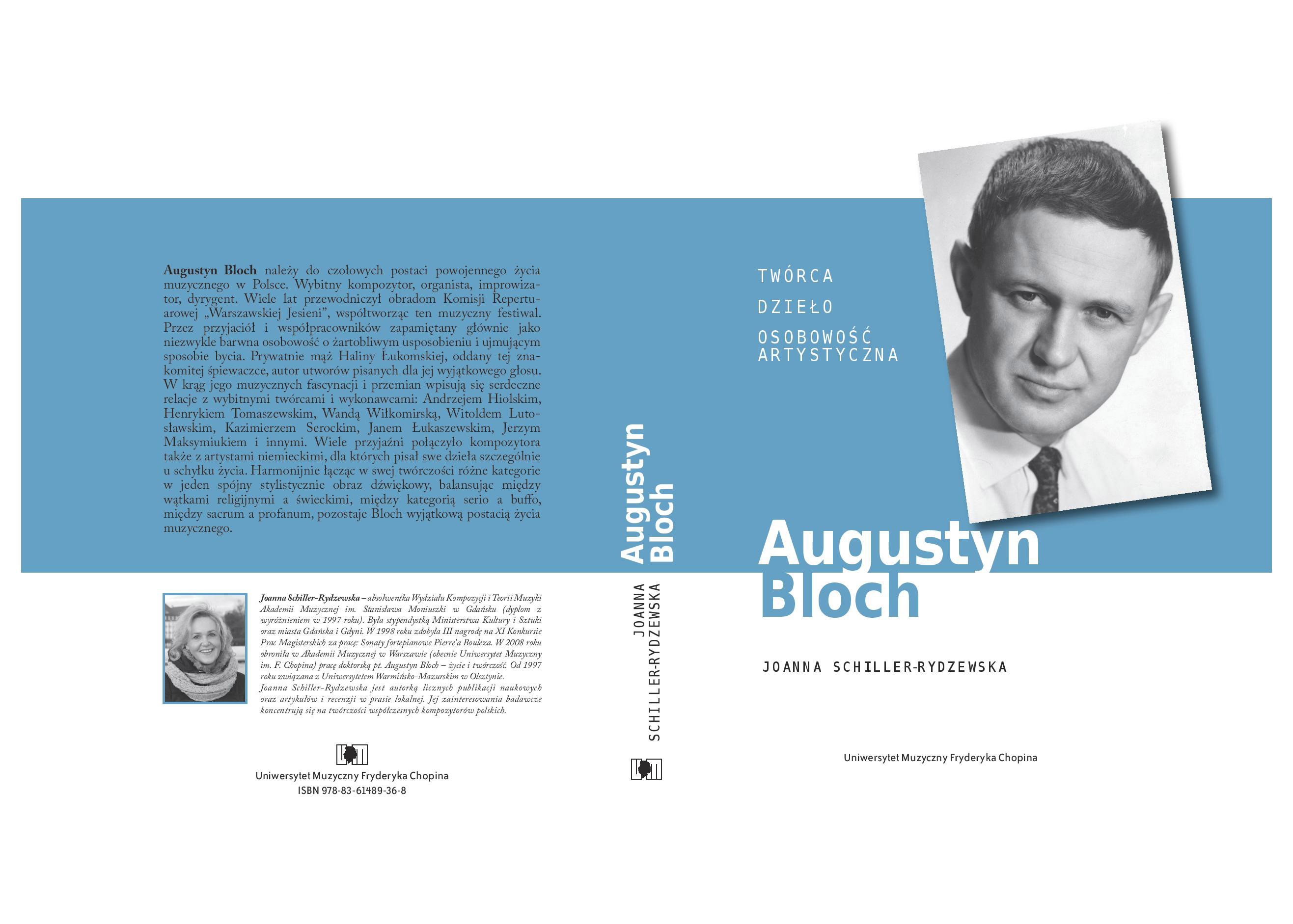 Wydawnictwo Uniwersytetu Muzycznego im. Fryderyka Chopina w Warszawie opublikowało książkę dr Joanny Schiller-Rydzewskiej pt. Augustyn Bloch- twórca, dzieło, osobowość artystyczna. Publikacja ukazała się w dziesięć lat po śmierci tego wybitnego kompozytora, organisty, dyrygenta i organizatora życia muzycznego, jest więc ważnym akcentem rocznicowym. Opatrzona przedmową Mieczysława Tomaszewskiego rozprawa stanowi kompendium wiedzy o artyście, jego życiu i twórczości, stanowi również ważne świadectwo czasu w jakim działał. Autorce serdecznie gratulujemy, a wszystkich zainteresowanych odsyłamy do lektury. Książka dostępna jest na stronie wydawnictwa: http://efryderyk.pl/57_schiller-rydzewski-joanna