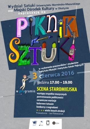 W piątek popołudniu odbył się Piknik Sztuki zorganizowany przy współpracy z Miejskim Ośrodkiem Kultury w Olsztynie. Wydarzenie odbyło się po raz czwarty. Na scenie staromiejskiej zaprezentowały się zespoły z Instytutu Muzyki. Przy miłych dźwiękach można było uczestniczyć w różnych atrakcjach np. lepienia z gliny, portretowania publiczności, malowania obrazu, kolorowych tatuaży czy performance. Dodatkową atrakcja była możliwość wygrania nagród podczas konkursów.