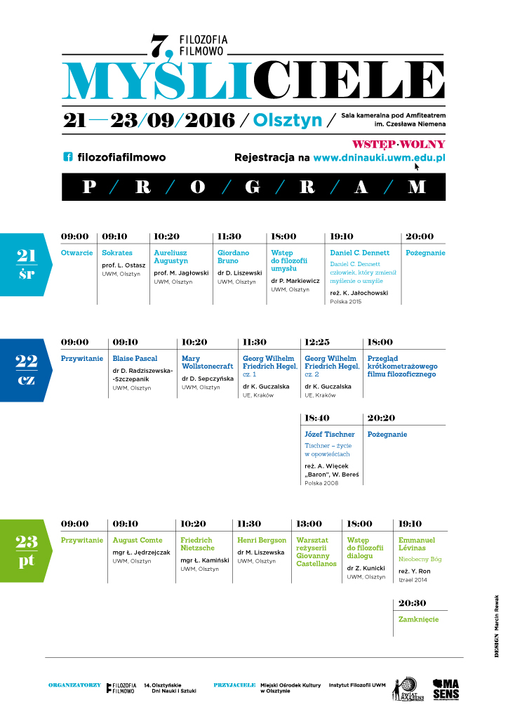 i pokazy filmów filozofujących. Kompetentni goście przedstawią myśl