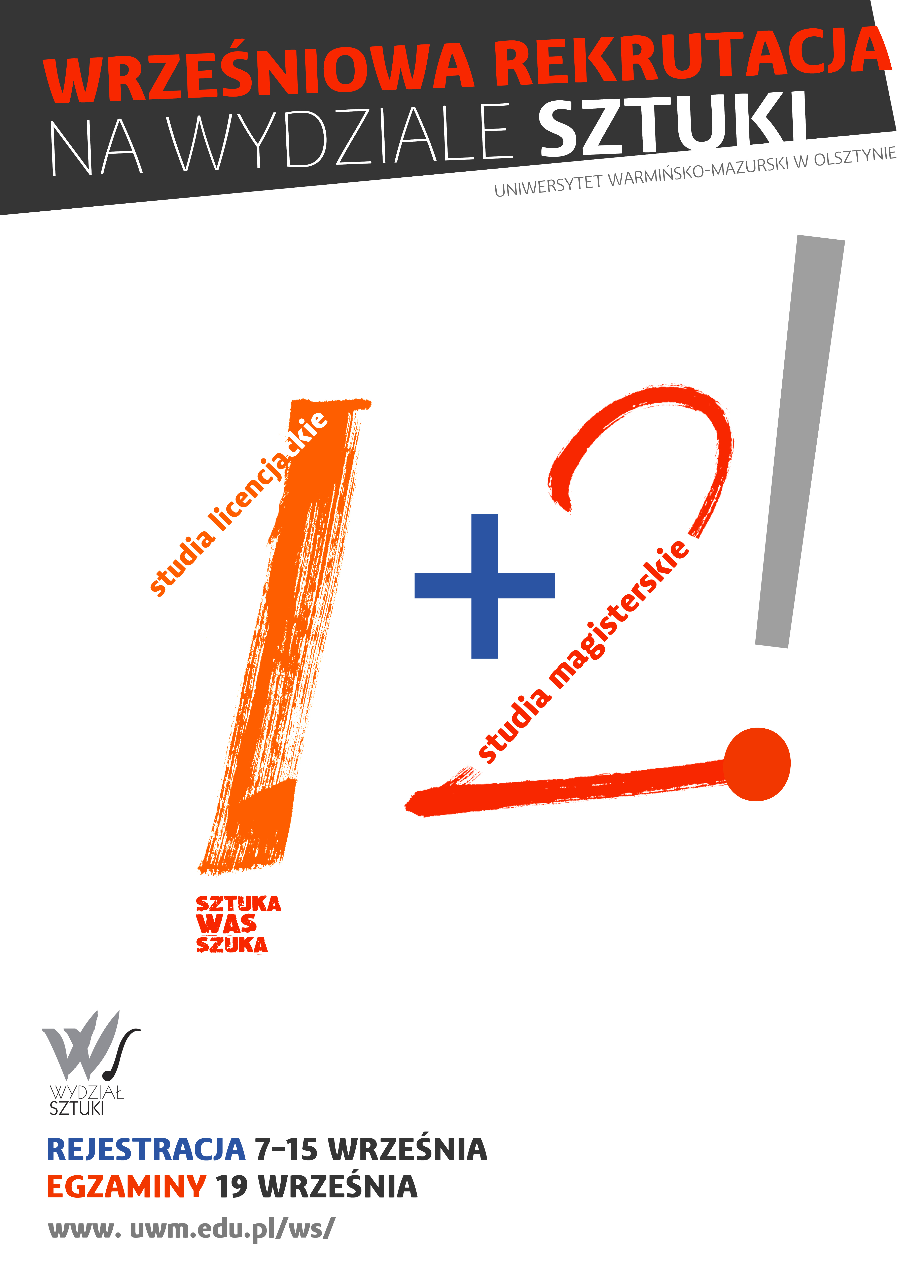 Z przyjemnością informujemy zainteresowane osoby, że we wrześniu 2017r. odbędzie się dodatkowy nabór na studia I i II stopnia na wydziale Sztuki UWM na kierunku Edukacja artystyczna w zakresie sztuki muzycznej oraz Edukacja artystyczna w zakresie sztuk plastycznych.