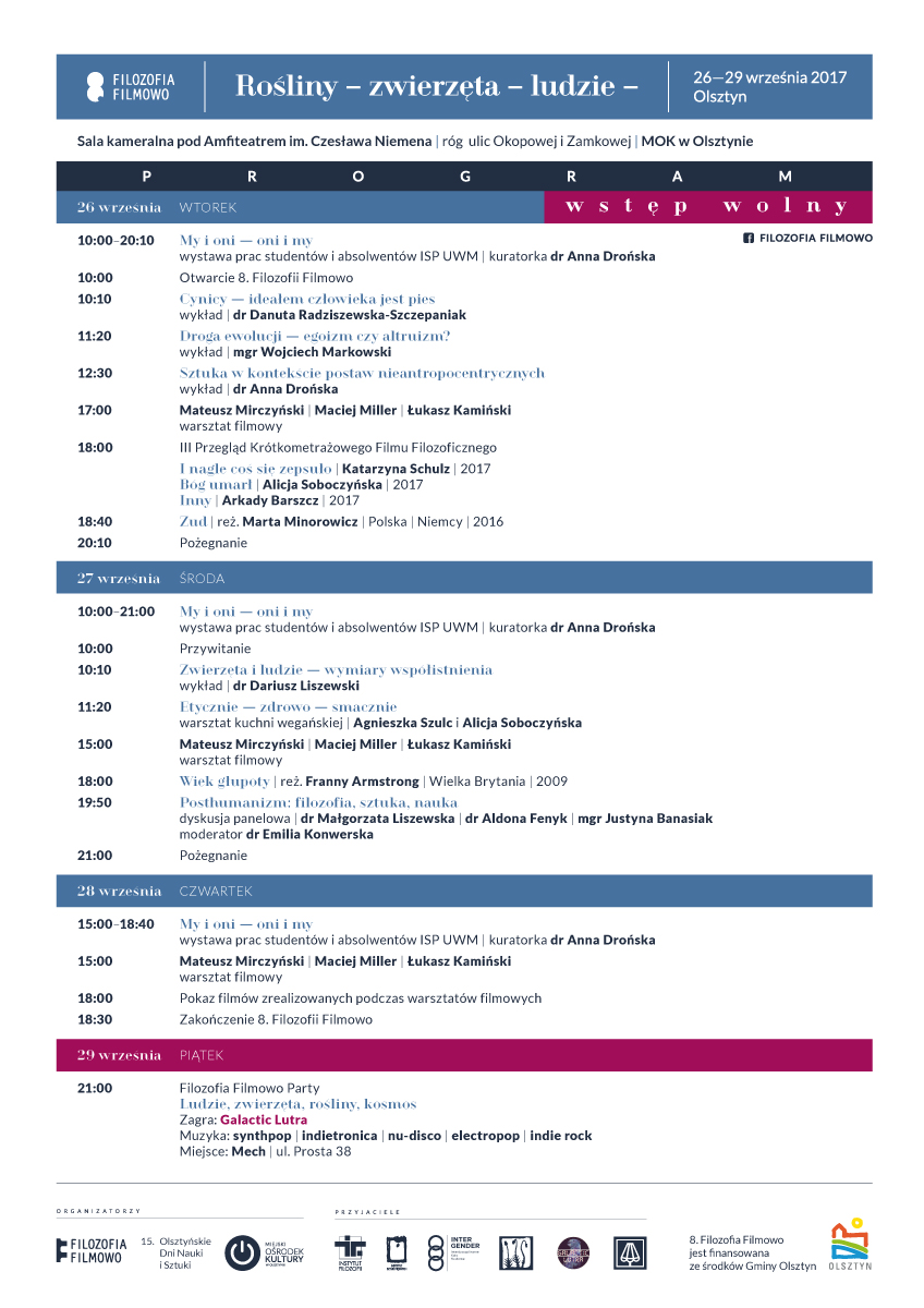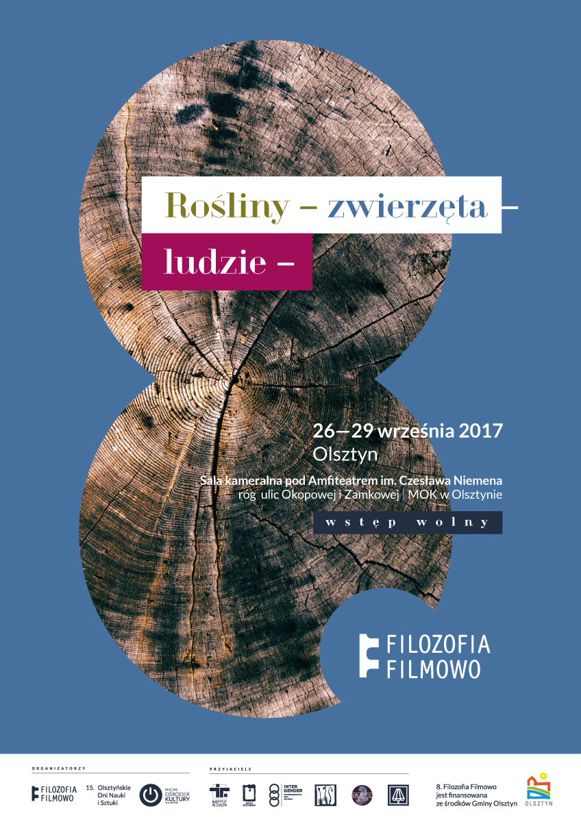 Filozofia Filmowo jest jednym z najstarszych tematycznych przeglądów filmowych na Warmii i Mazurach. Jej ósma edycja jest poświęcona tematyce wzajemnych relacji pomiędzy światem przyrodniczym a człowiekiem. Zapraszamy do dyskusji o takich kwestiach, jak: człowiek wobec zwierząt, człowiek jako zwierzę, porozumienie międzygatunkowe, człowiek wobec roślin, człowiek jako roślina. Odbędą się: wykłady z zakresu filozofii oraz estetyki (pracowników i doktorantów UWM w Olsztynie), pokazy filmów (np. „Zud”, który otrzymał m.in. nominację do Kryształowego Niedźwiedzia podczas Międzynarodowego Festiwalu Filmowego w Berlinie, nominację do Golden Space Needle Award podczas Seattle International Film Festival, nagrodę Fathy Farag za największy wkład artystyczny podczas Cairo International Film Critics Week), warsztat kuchni wegańskiej, warsztat filmowy, wystawa sztuk wizualnych (studentów i absolwentów Instytutu Sztuk Pięknych UWM w Olsztynie), dyskusja panelowa, muzyczne after party. Po raz trzeci podczas Filozofii Filmowo pojawi się przegląd krótkometrażowych filmów filozoficznych, jest to pierwszy taki przegląd w kraju, a może i na świecie.