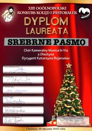 Studentki Koła artystyczno – naukowego MUSICA IN VIA, działającego w Instytucie Muzyki Wydziału Sztuki UWM pod dyrekcją dr hab. Katarzyny Bojaruniec prof. UWM, w dniu 20 stycznia 2018 r. brały udział w XIII Ogólnopolskim Konkursie Kolęd i Pastorałek w Chełmnie. Zespół zdobył Dyplom Laureata Srebrnego Pasma oraz Nagrodę - Puchar Dyrektora Artystycznego Konkursu.