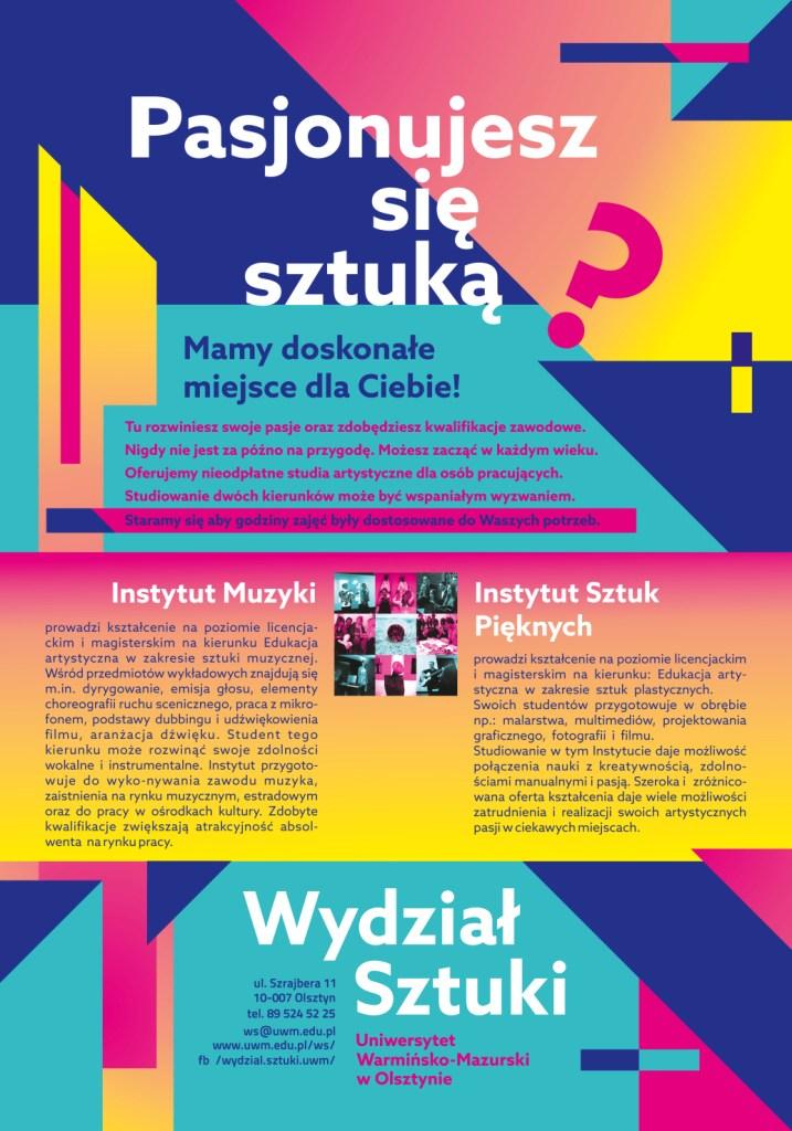 Przypominamy, że od 7 do 14 września trwa dodatkowy nabór na studia na Wydziale Sztuki. Zapraszamy wszystkie osoby, które jeszcze nie podjeły decyzji lub wachają się z nią. Program studiów w Instytucie Muzyki oraz Instytucie Sztuk Plastycznych jest stale udoskonalany i dopasowywany do wymogów współczesnego rynku pracy. Kadrę dydaktyczną Wydziału Sztuki stanowią wysoko kwalifikowani nauczyciele akademiccy, w tym pedagodzy różnych specjalności oraz znani artyści.