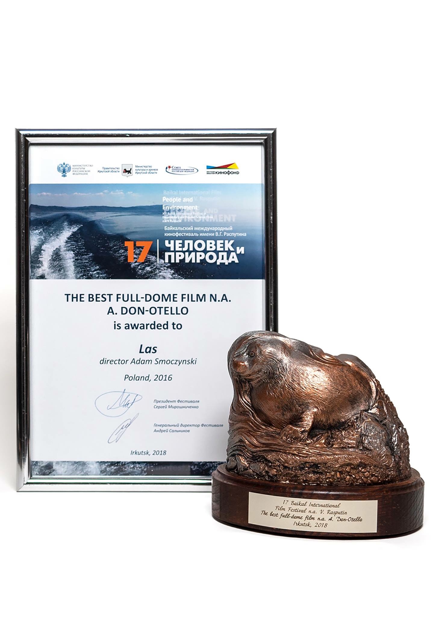 Informujemy o przyznaniu nagrody za Najlepszy Film w kategorii "Full-Dome" (filmów przeznaczonych do projekcji w kopułach planetariów) 17 Międzynarodowego Konkursu Filmowego "People & Environment" w Irkucku produkcji "LAS - zobaczyć niedostrzegalne" reżysera Adama Smoczyńskiego z muzyką i ścieżką dźwiękową prof. Marcina Wawruka – wykładowcy Wydziału Sztuki UWM. To jedna z niewielu takich nagród w Polsce! Film konkurował w swojej kategorii z filmami przyrodniczymi z Czech, Japonii, Chin, USA, Nowej Zelandii, Grecji i Meksyku.